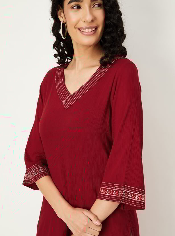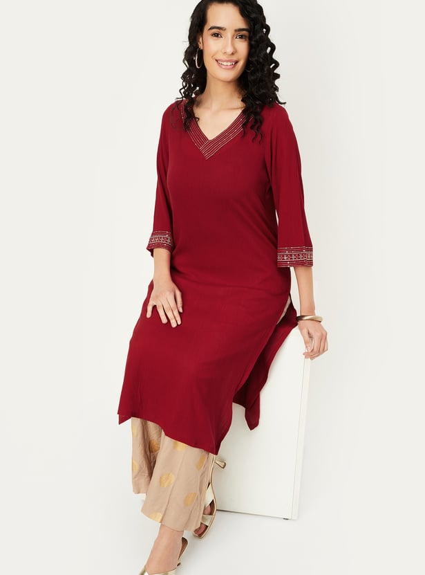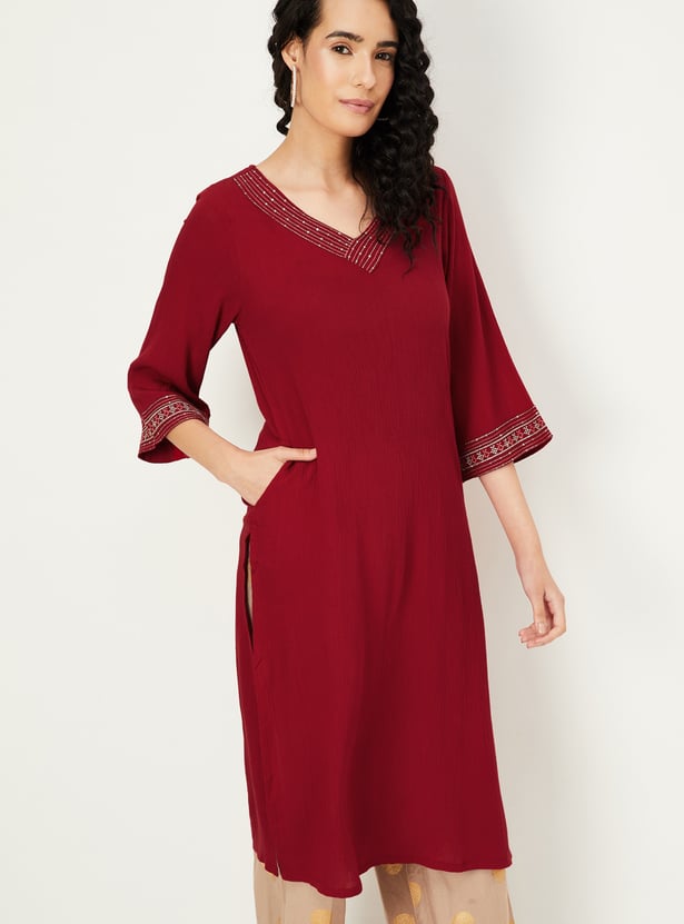 A stunning addition to your ethnic wardrobe, this kurta features a V-neck with embroidery detailing, side pocket, three-quarter sleeves, and knee-length construction. Perfect for any occasion, it combines traditional charm with contemporary style.