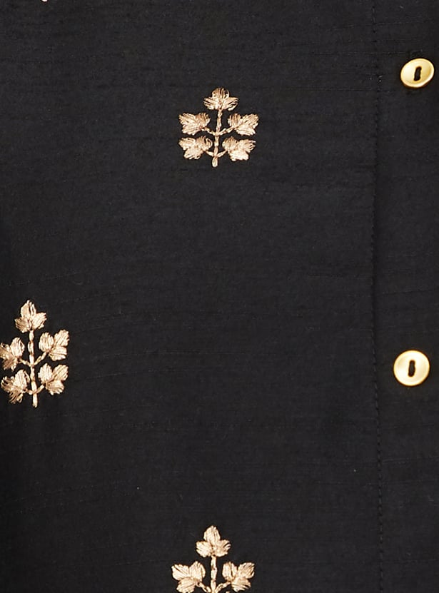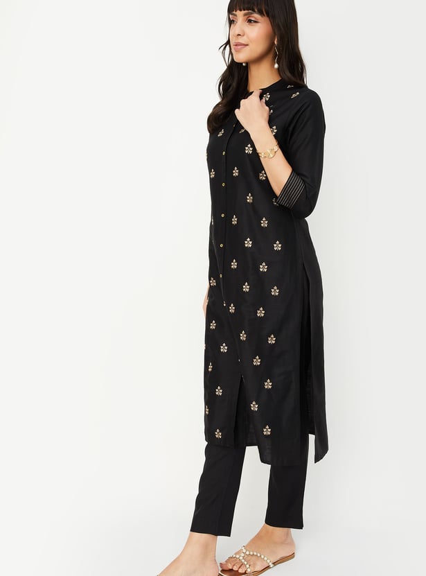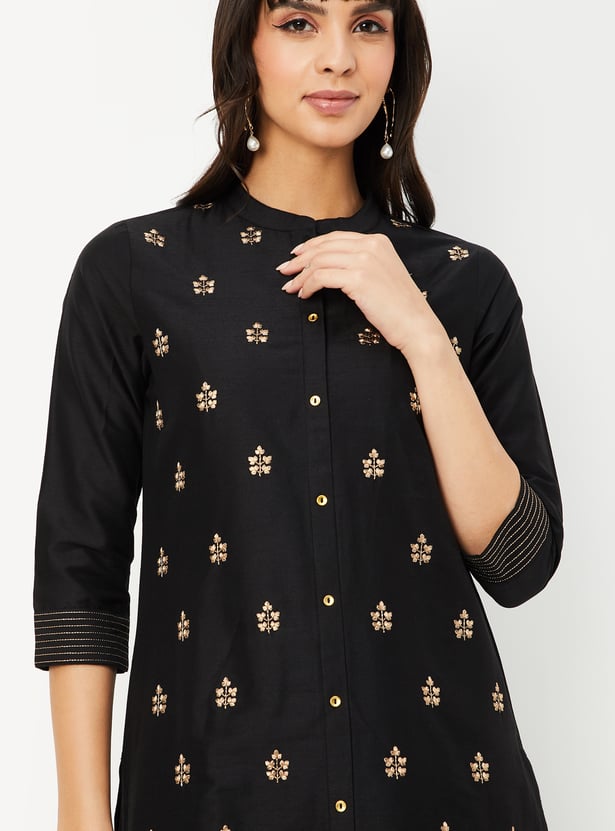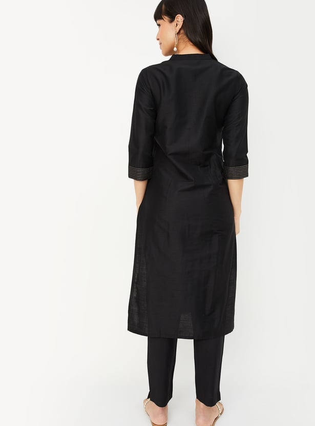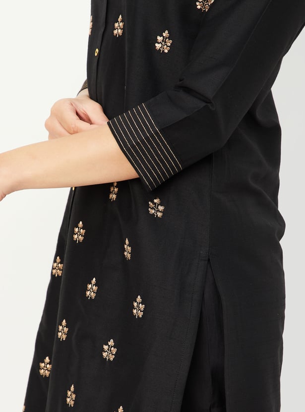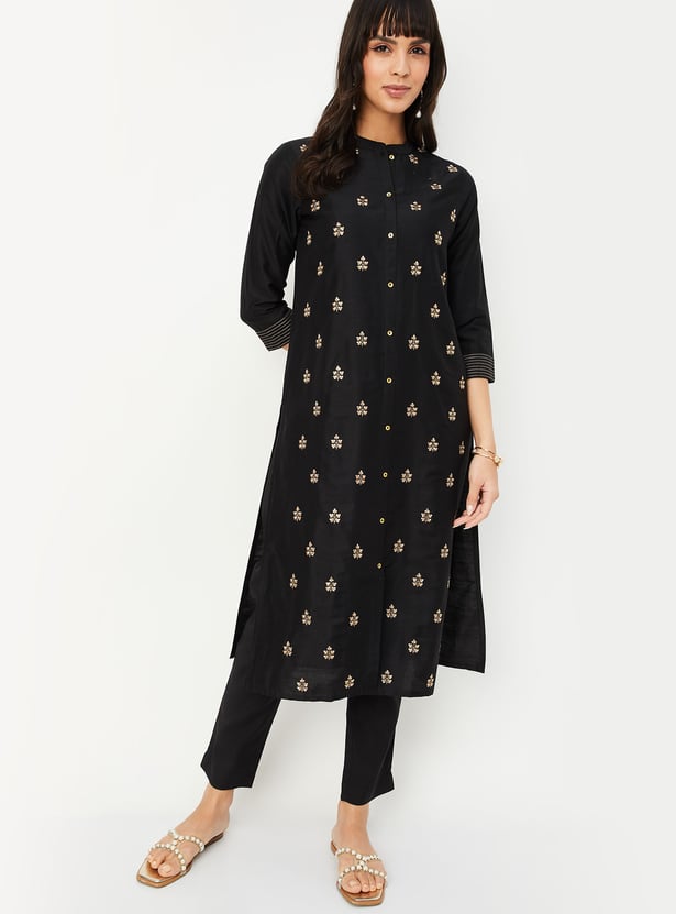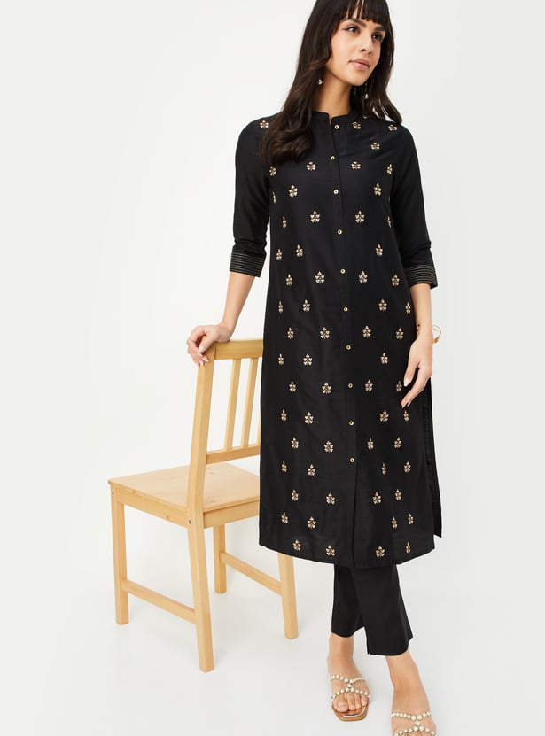 Elevate your everyday ethnic wear with this embroidered straight kurta featuring a band collar, button placket, 3/4th sleeves, and classic side slits. The intricate embroidery adds a touch of charm to this timeless silhouette.