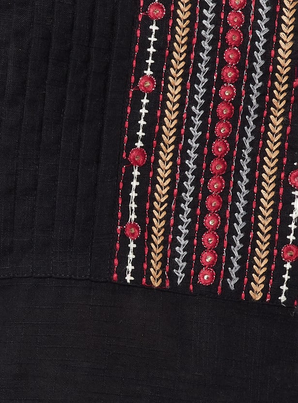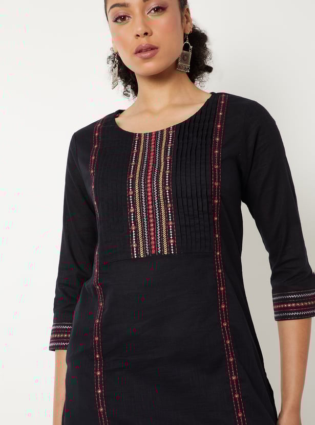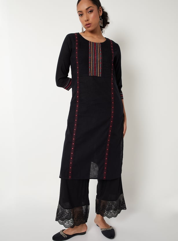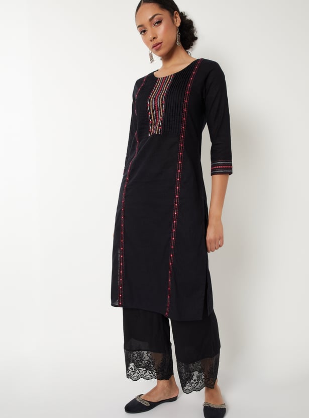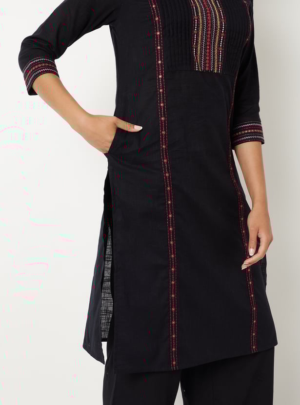 Elevate your everyday look with this elegant straight kurta. Featuring delicate pleats, yoke embroidery, a round neck, and three-quarter sleeves, it blends tradition with modern charm. The side pocket adds a practical touch to its graceful silhouette.