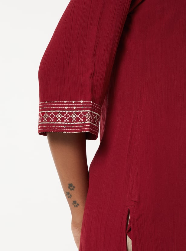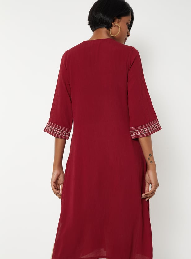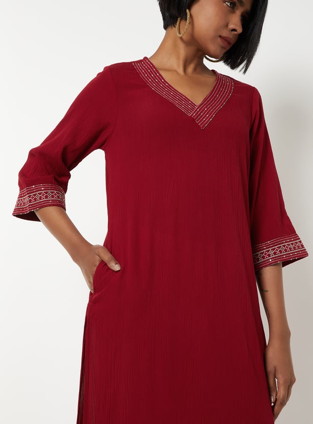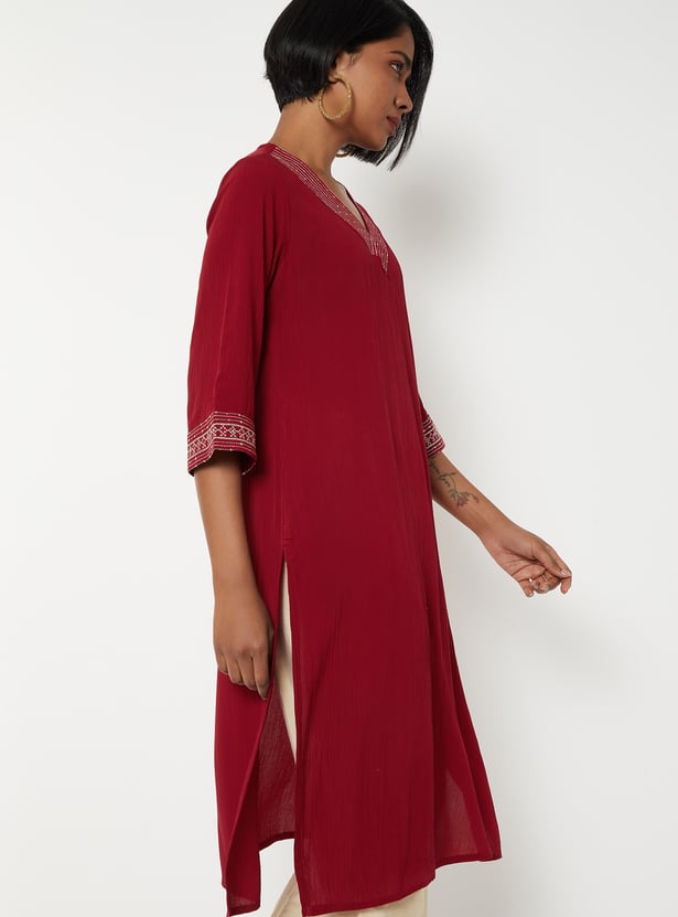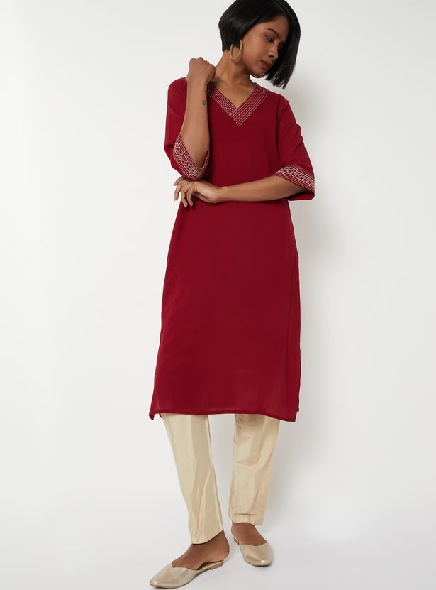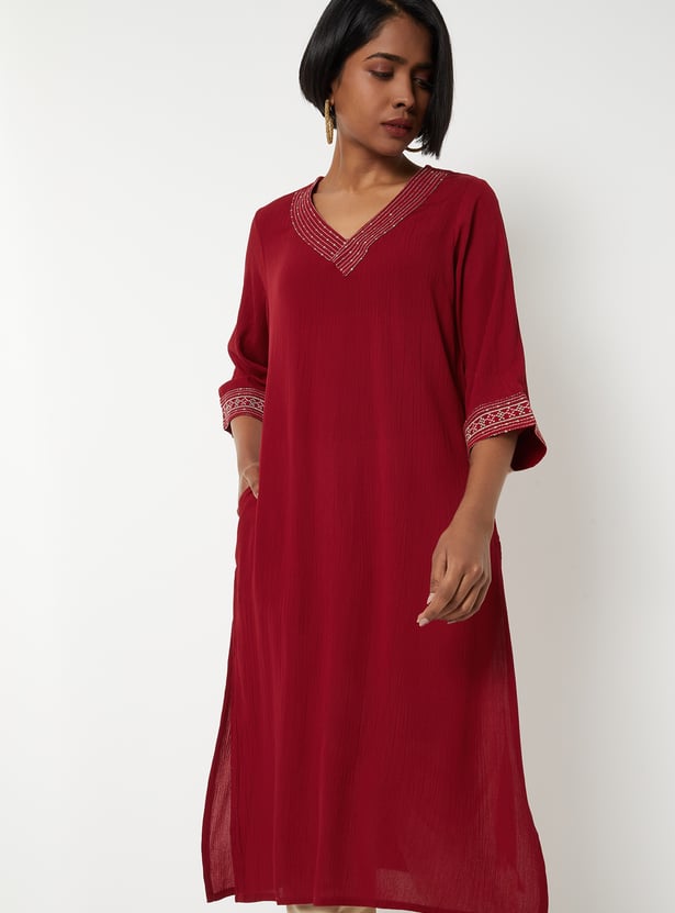 This embroidered straight kurta is crafted with a graceful V-neckline, 3/4th sleeves, and side slits for ease of movement. A practical side pocket adds functionality, while the delicate embroidery elevates its understated silhouette.