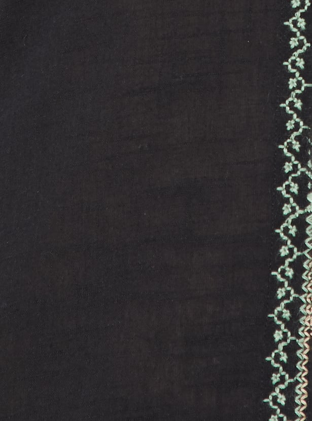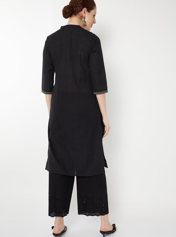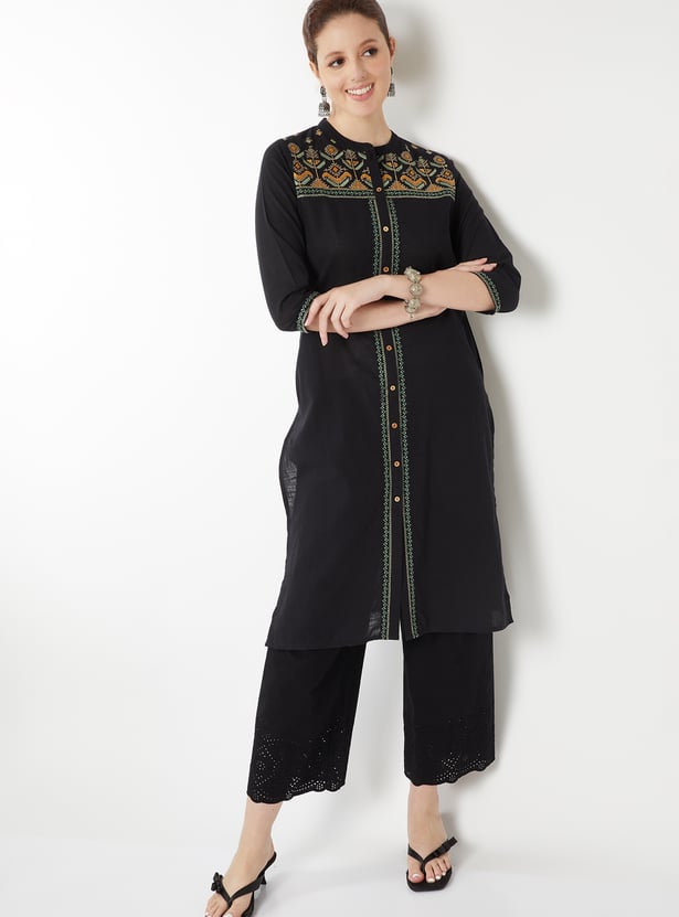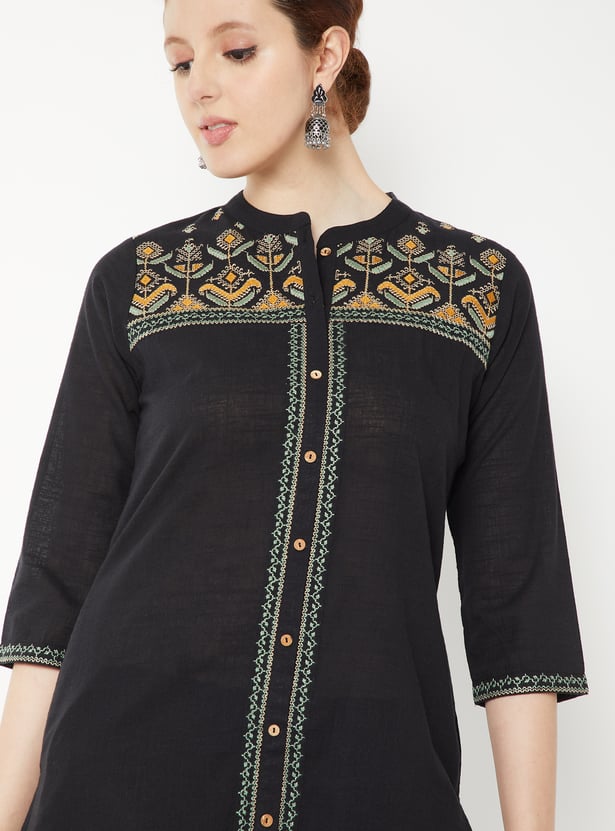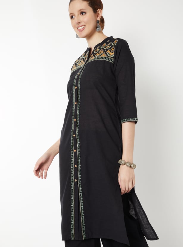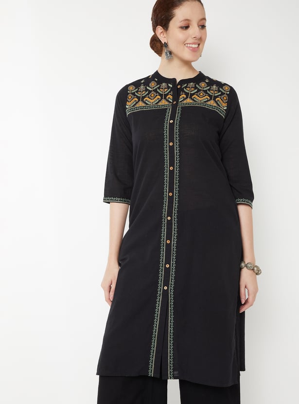Elevate your ethnic wardrobe with this embroidered kurta designed for everyday elegance. Featuring a band collar, centre panel embroidery, button-down front, 3/4th sleeves, straight silhouette, and a functional side pocket.