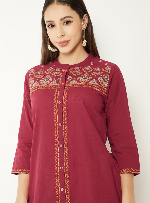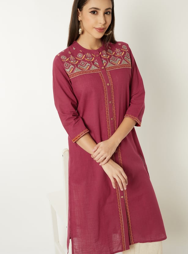 Elevate your ethnic wardrobe with this embroidered kurta designed for everyday elegance. Featuring a band collar, centre panel embroidery, button-down front, 3/4th sleeves, straight silhouette, and a functional side pocket.