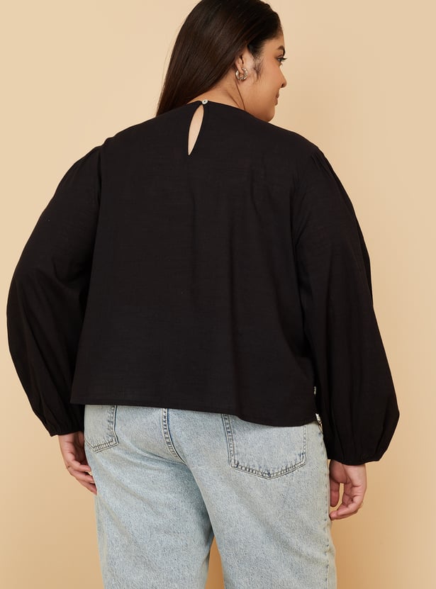 This embroidered top features a clean round neck and 3/4th puffed sleeves with elasticated openings, creating a soft, romantic silhouette. The delicate embroidery and button-and-hoop back closure add an elegant, handcrafted finish. Model Size :
