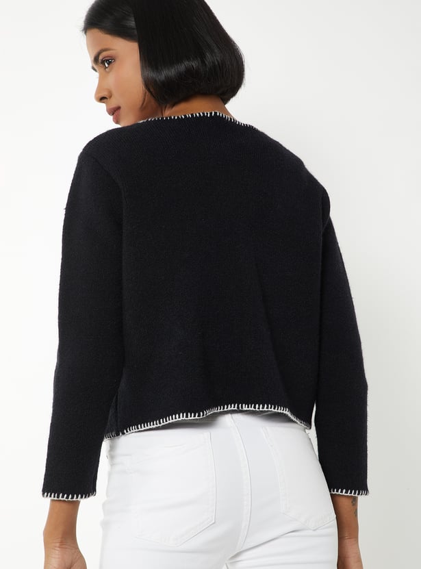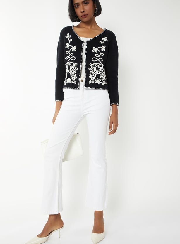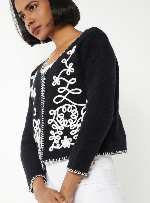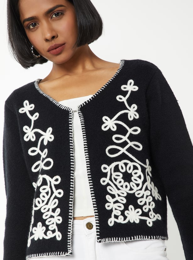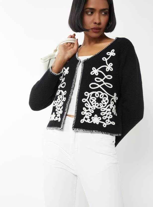 Step out in elegant style with this floral applique jacket. Designed with an open front, round neck, and full sleeves, it adds a chic layer to any outfit.