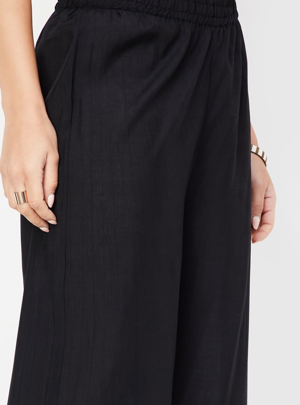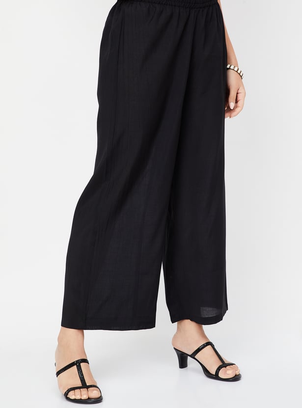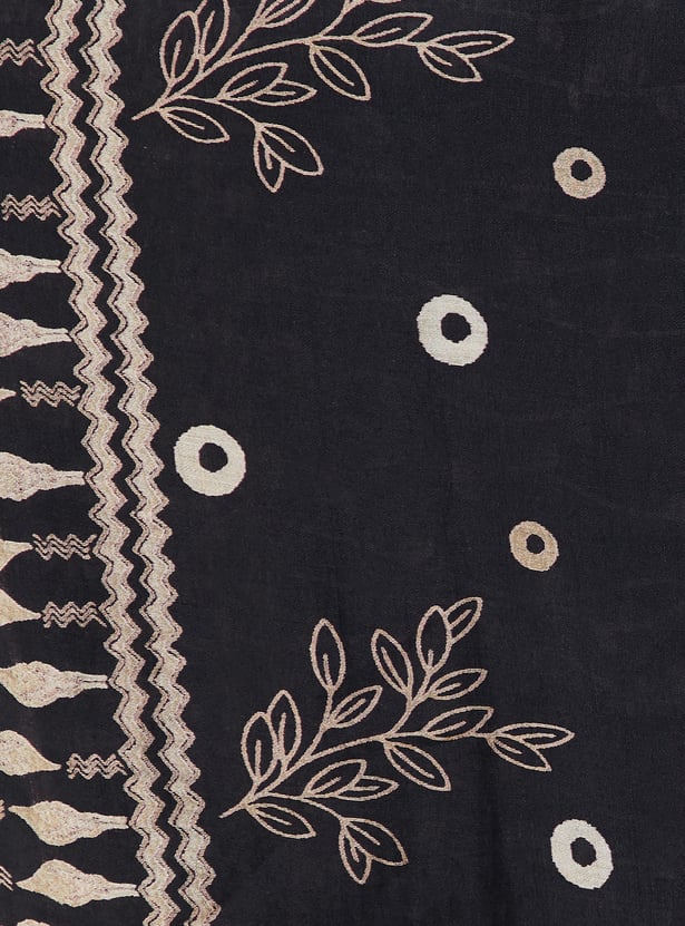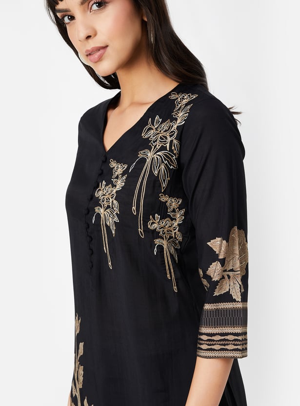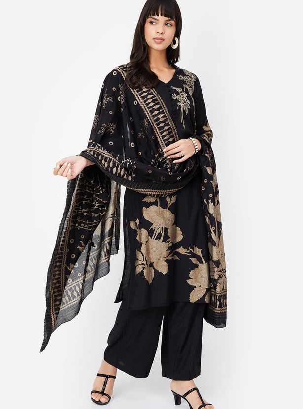 This elegant kurta set features a floral embroidered straight kurta with a flattering V-neck, 3/4th sleeves, and side slits for added ease. It’s paired with comfortable elasticated waist palazzos and a matching dupatta to complete the look.