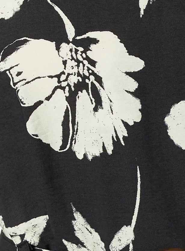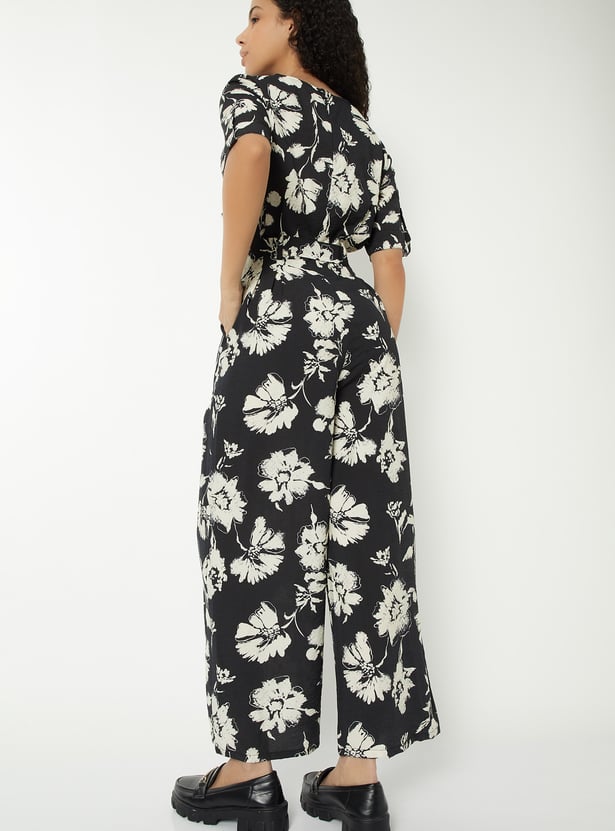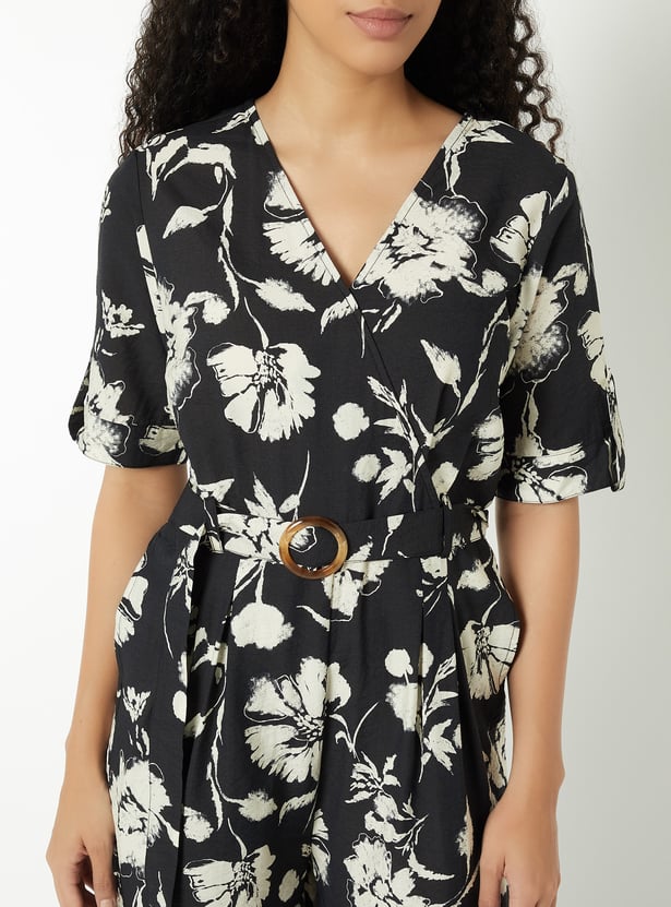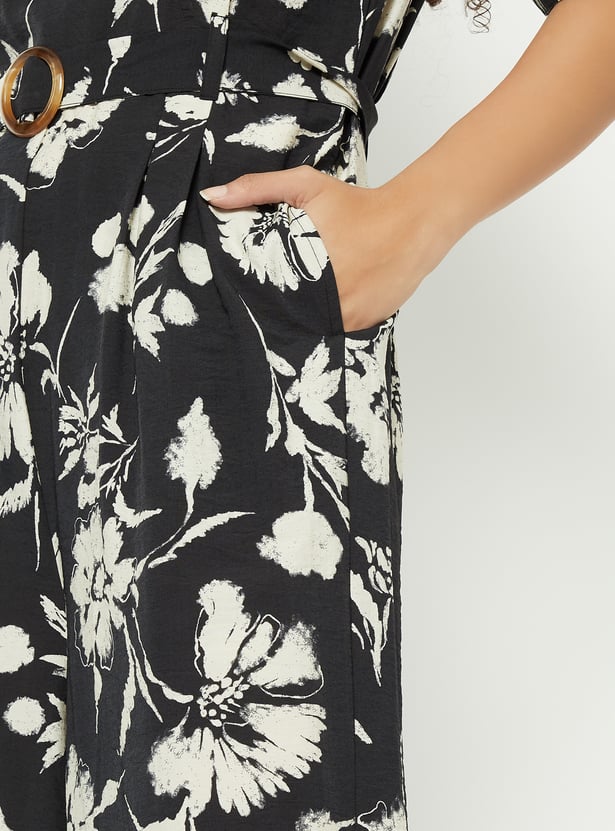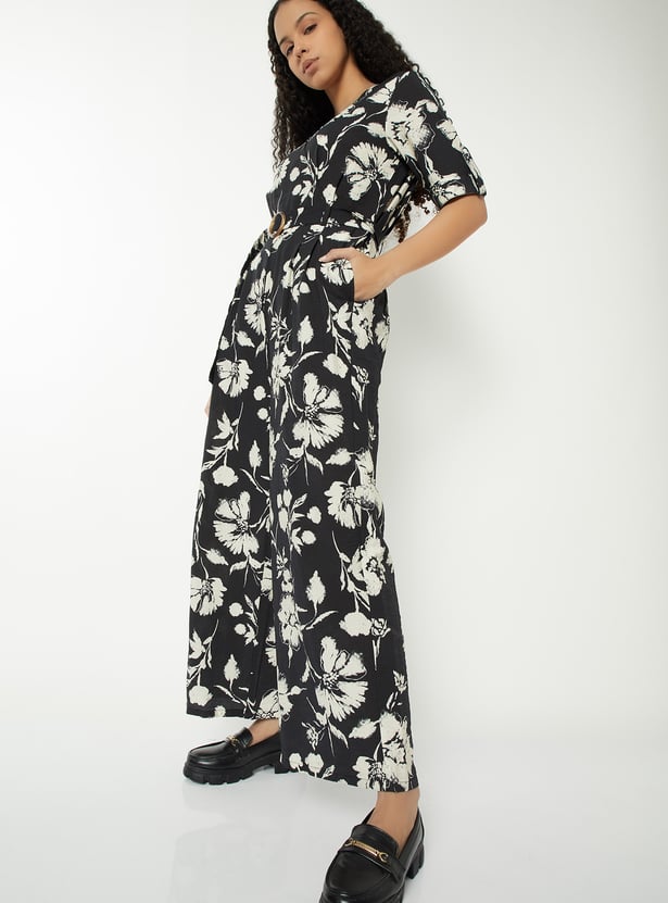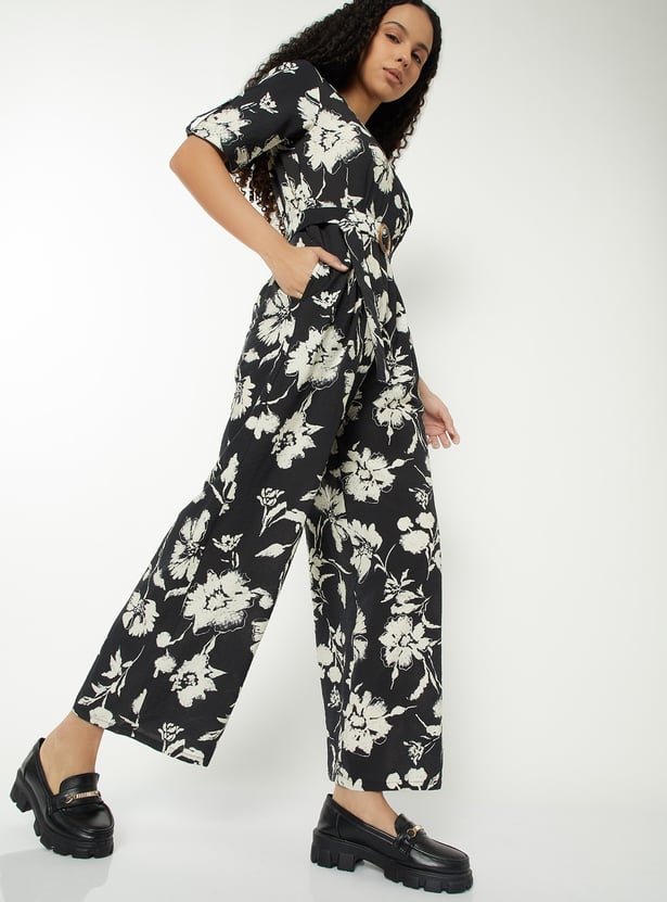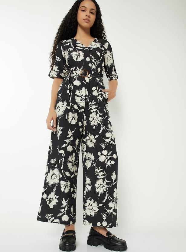 This floral print jumpsuit features a flattering V-neckline, half rolled-up sleeves, and a belted waist that enhances the silhouette. The ankle-length design adds a touch of effortless sophistication.