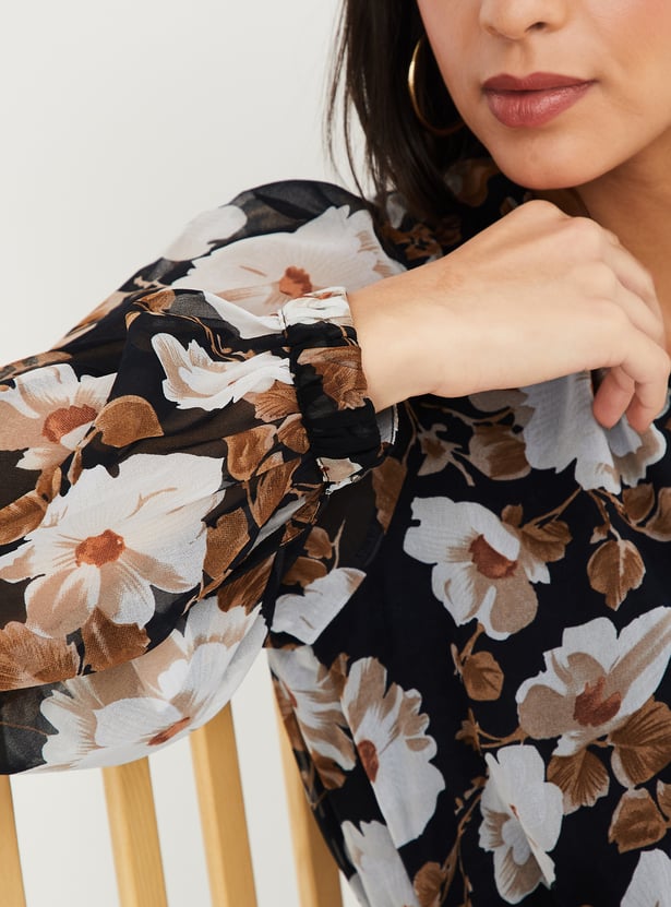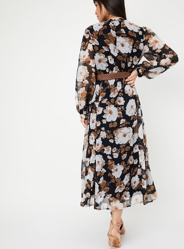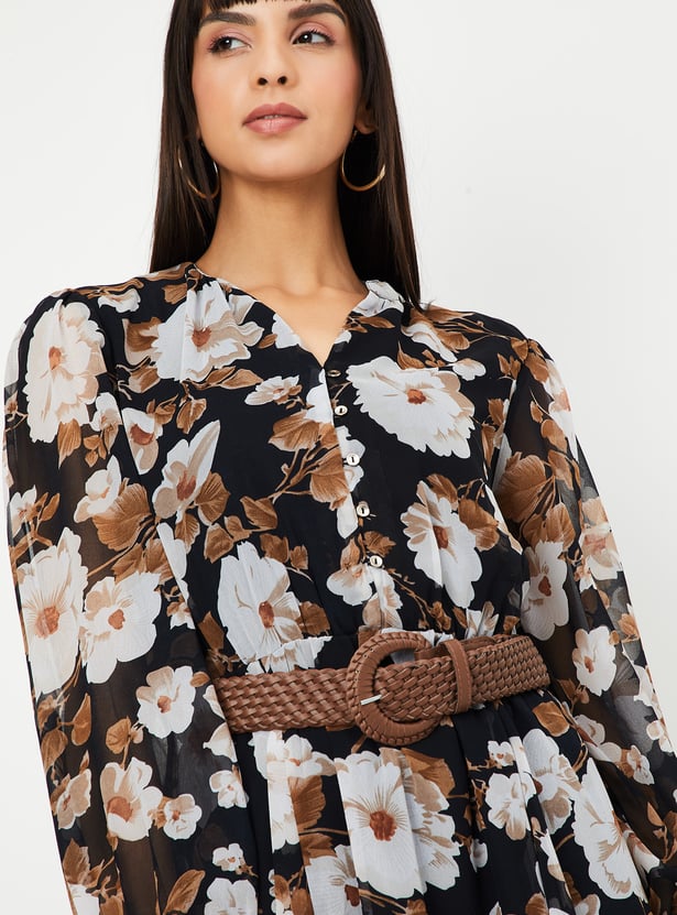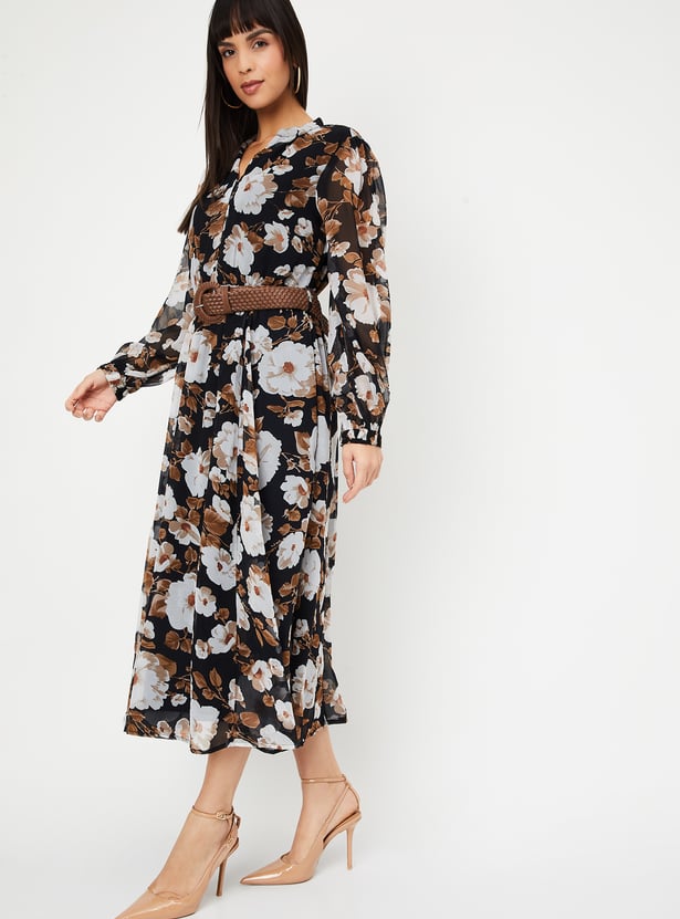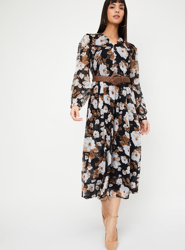This floral print midi dress effortlessly combines elegance and charm. Featuring a flattering band collar, buttoned front, and full sleeves, it comes complete with a belt to cinch the waist and enhance your silhouette. Model Size :