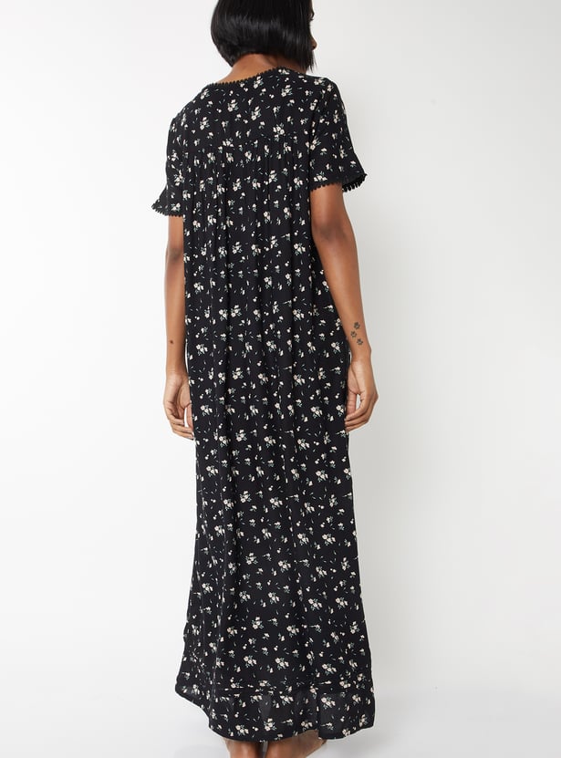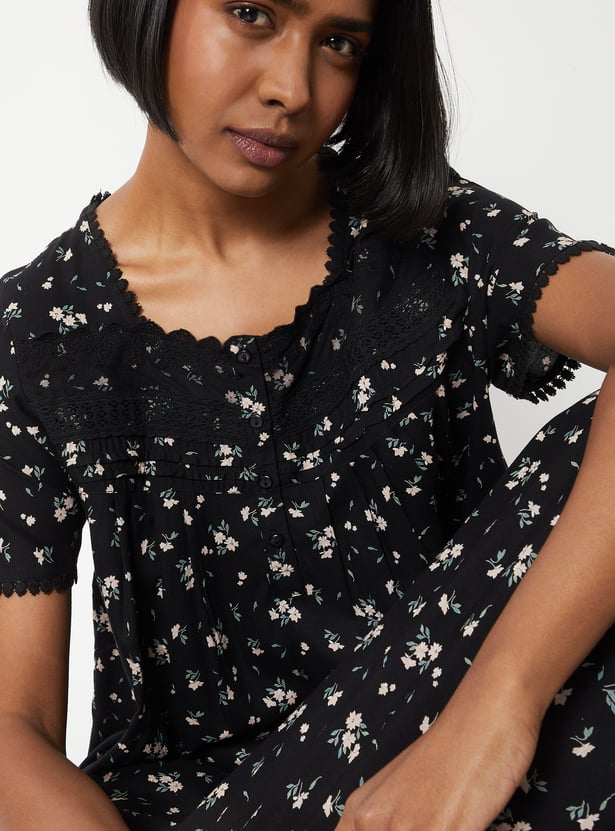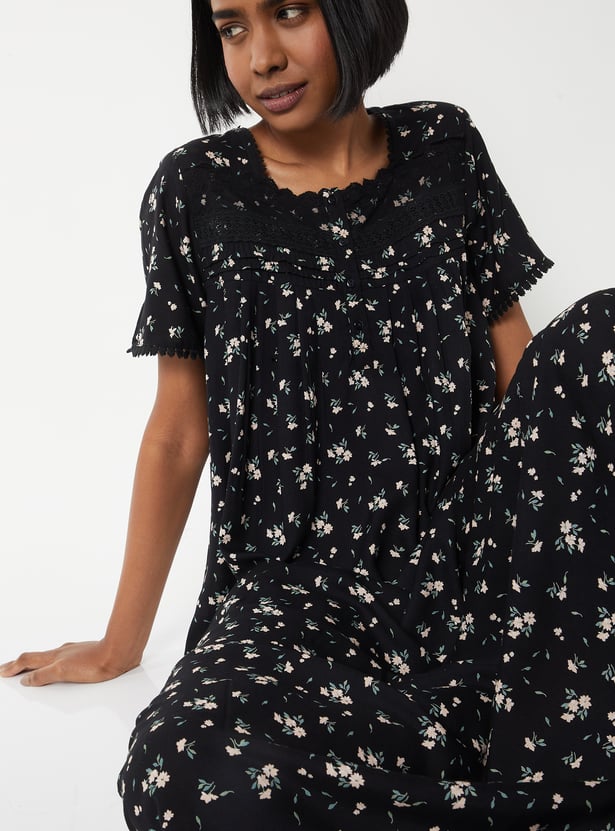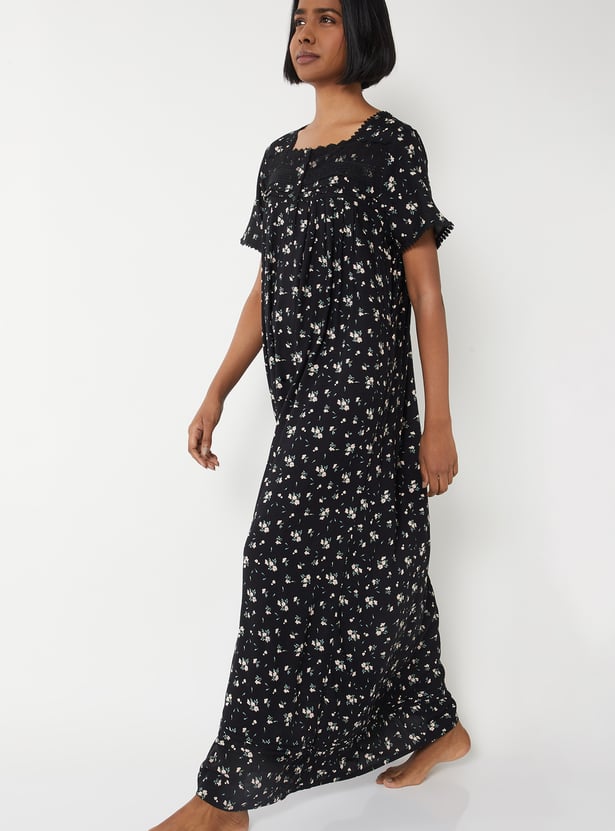 This floral print night gown is a graceful blend of comfort and charm. Featuring a square neck and half sleeves, it offers a relaxed fit perfect for lounging or bedtime. The button closure adds a classic touch, while the floral print brings a soft, feminine appeal. Model Size :