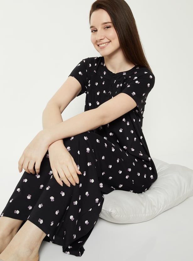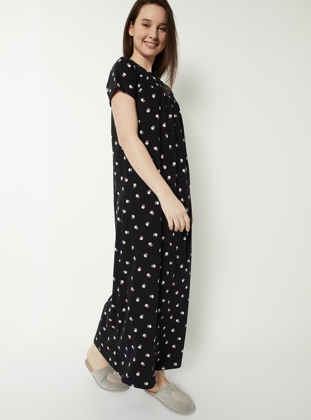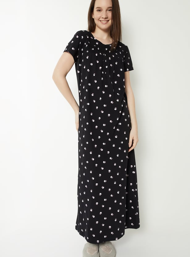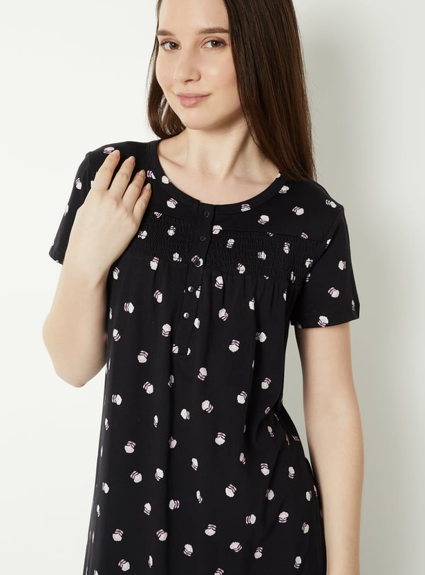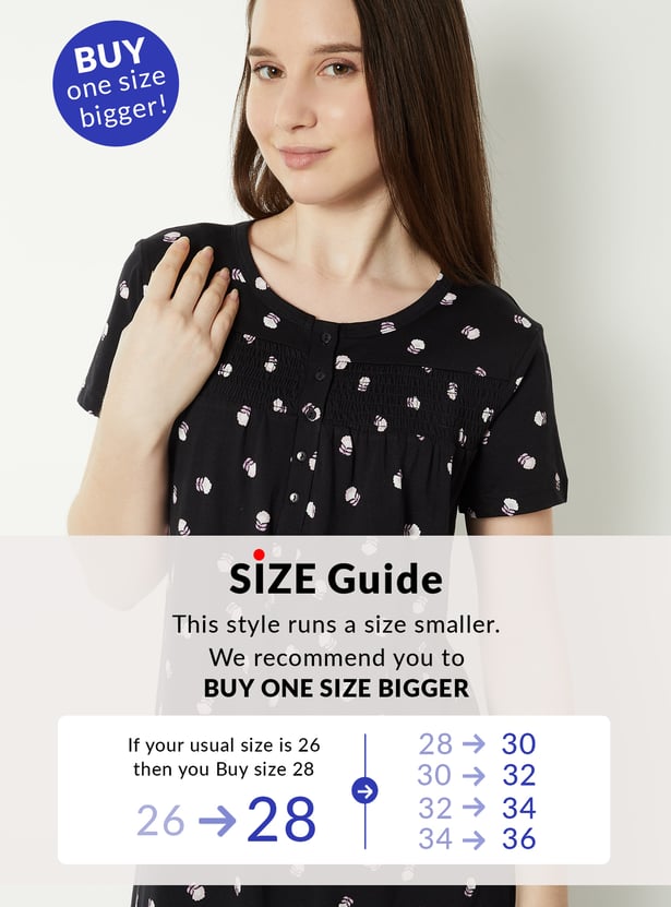 Embrace dreamy comfort with this nightgown, adorned with an all-over floral pattern for a soft, feminine touch. The round neck and half sleeves offer relaxed ease, while the smocked panel adds gentle shaping and detail. Model Size :