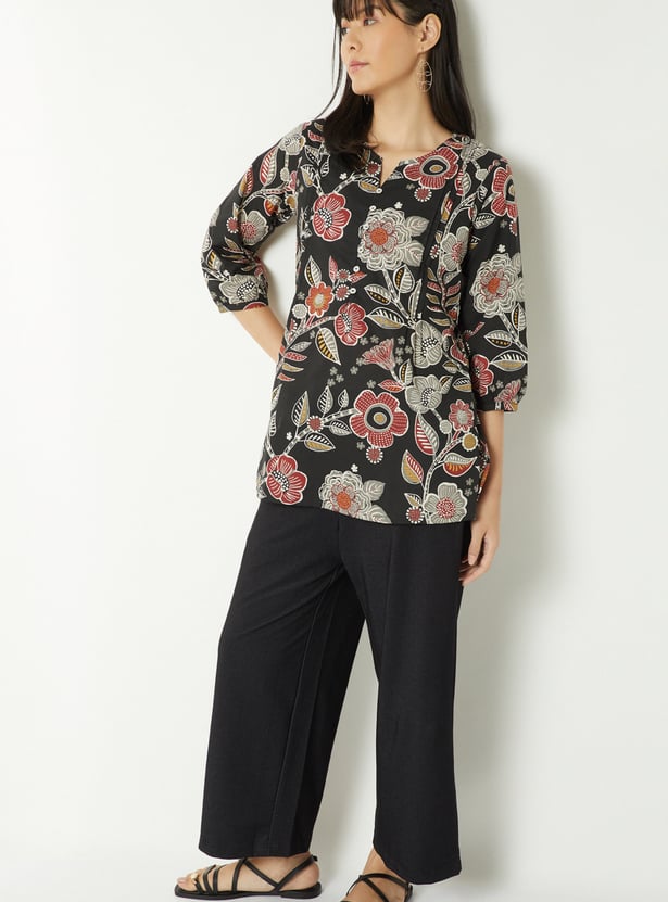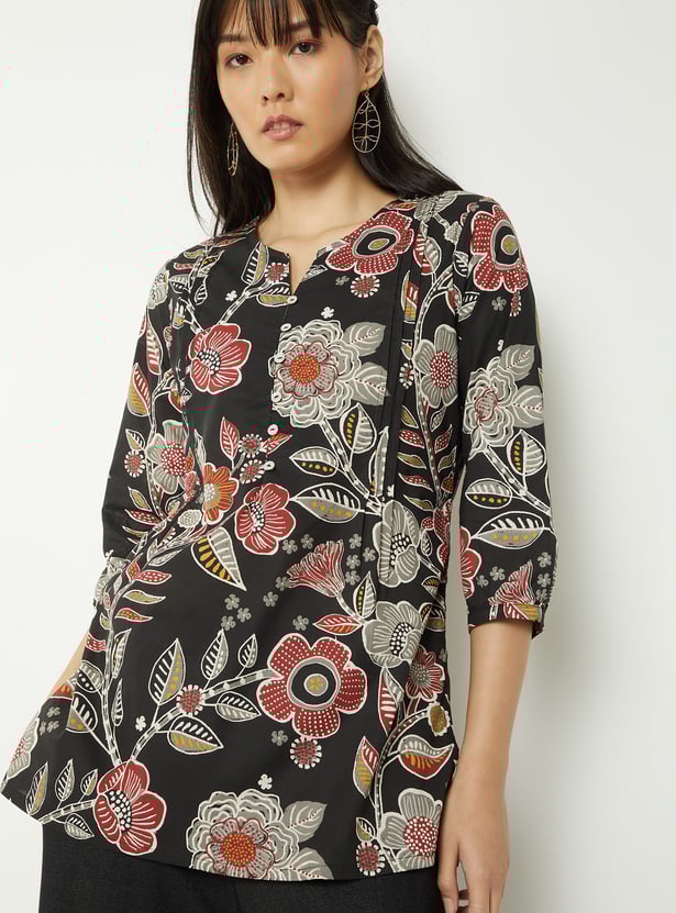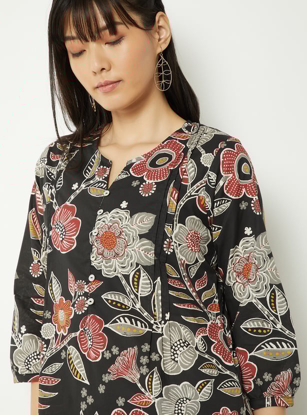 Add a fresh touch to your everyday wardrobe with this floral print kurti, designed with a flattering notched neckline, side slits, and elegant 3/4th sleeves. Crafted for a comfortable fit, it offers an easy silhouette that’s perfect for all-day wear.