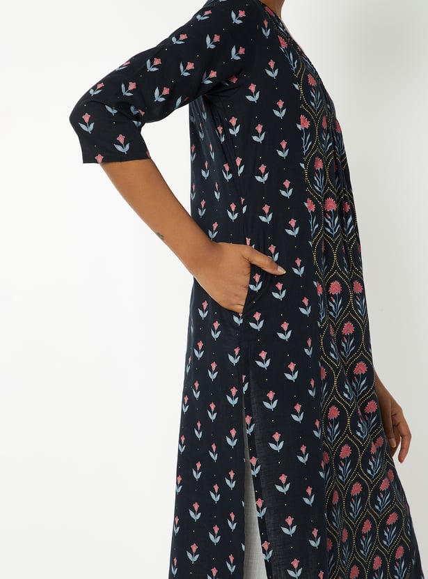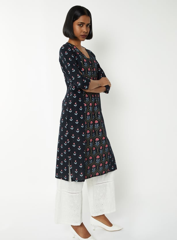 Paint a picture of elegance in this straight kurta. The floral prints add a sophisticated touch, while the waist pocket offers convenience. It features a V-neck and three-quarter sleeve with lace trim for added allure.