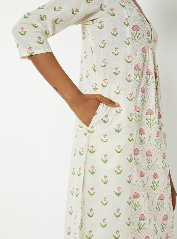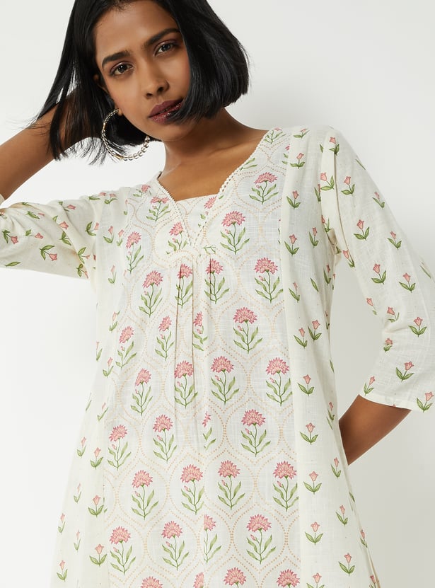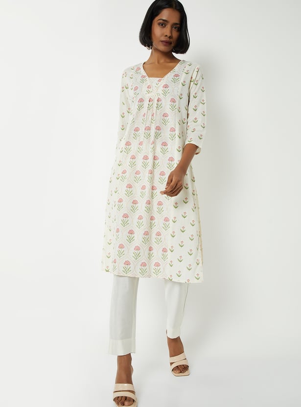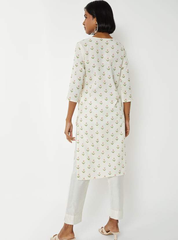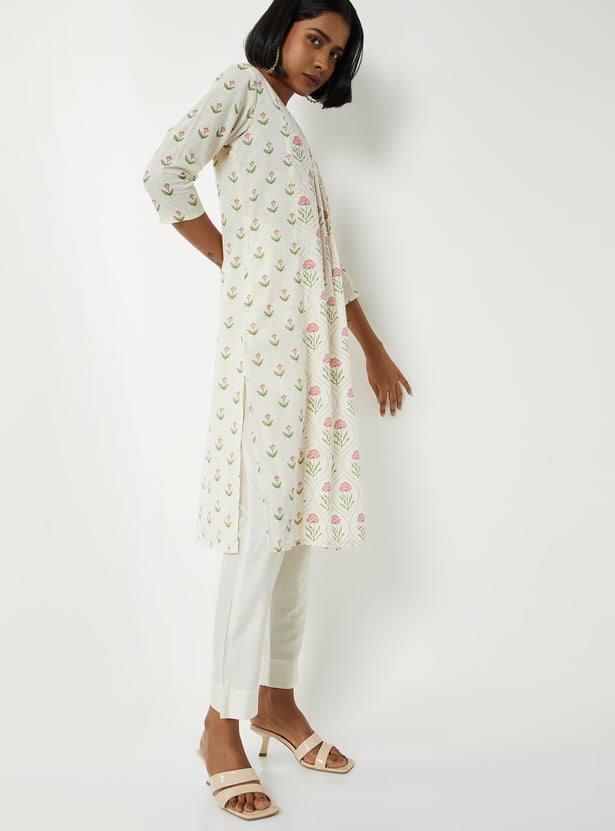 Paint a picture of elegance in this straight kurta. The floral prints add a sophisticated touch, while the waist pocket offers convenience. It features a V-neck and three-quarter sleeve with lace trim for added allure.
