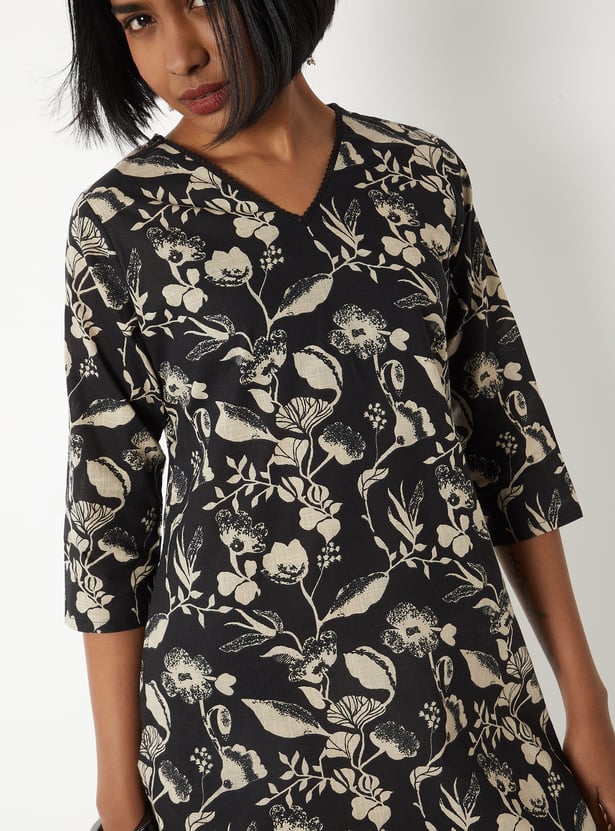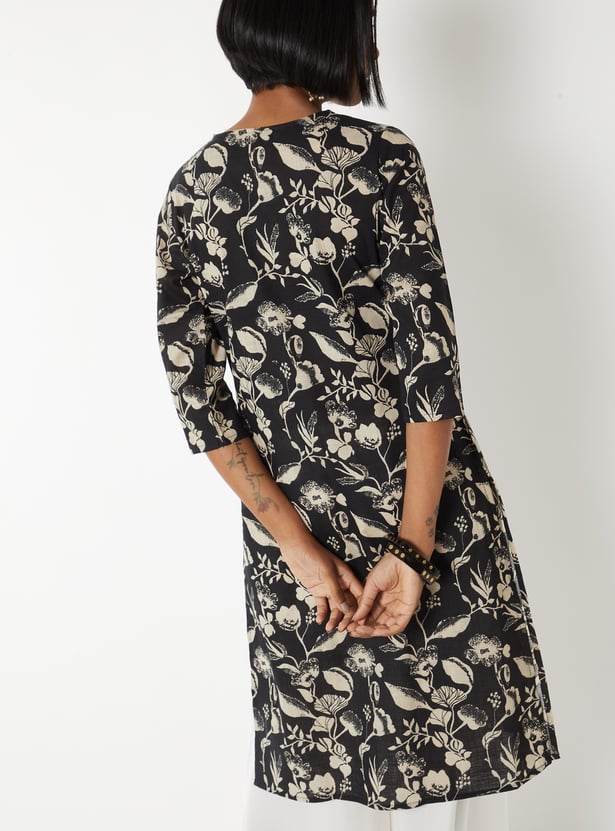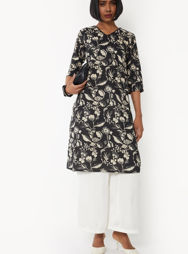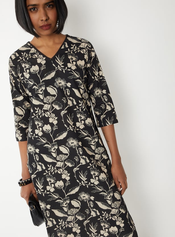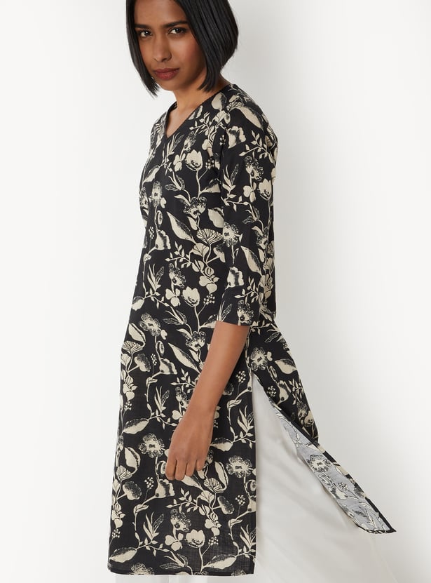 This floral print straight kurta is a perfect mix of elegance and ease. Designed with a flattering V-neck and 3/4th sleeves, it offers a comfortable yet stylish silhouette. Side slits add flow and movement, while the side pocket brings in practical functionality.