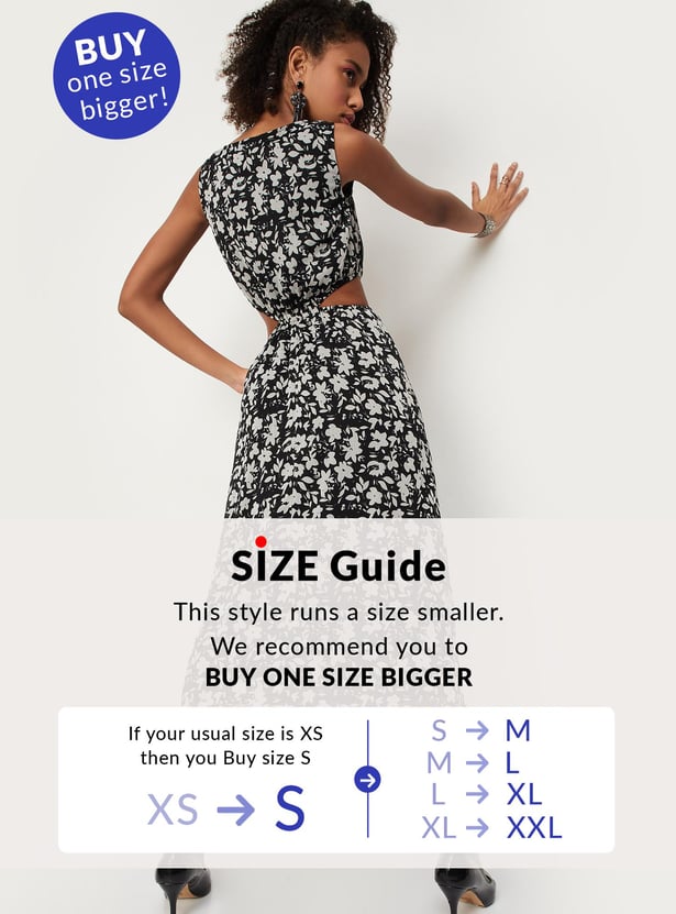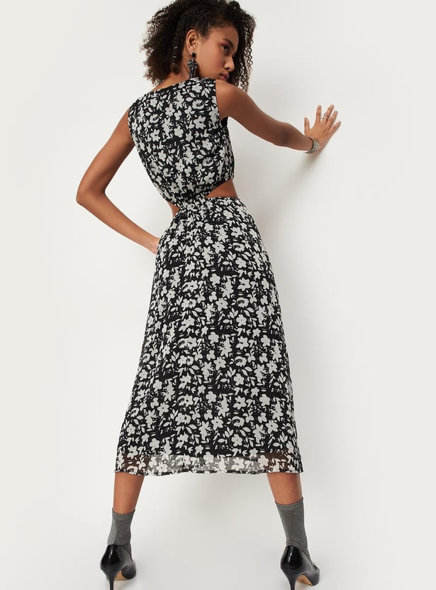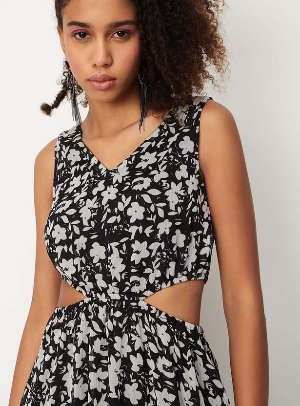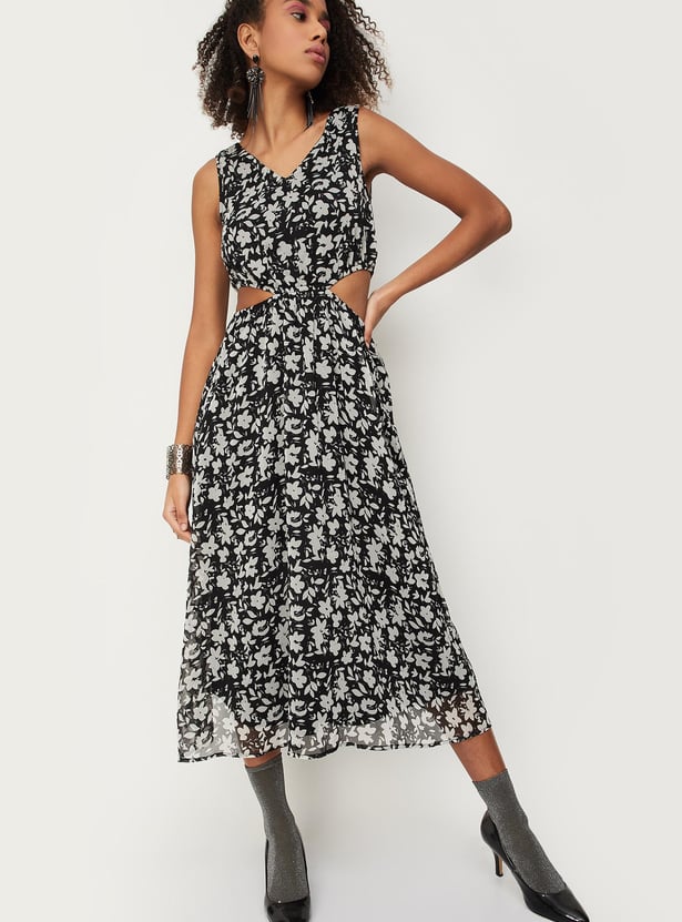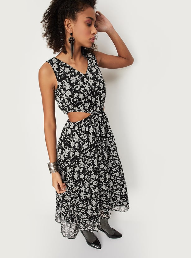 Make a chic statement in this midi-length dress adorned with all-over floral prints. It features a V-neck, sleeveless profile, cut-outs at the waist, and a layered skirt. For an edgy look, style this dress with boots.