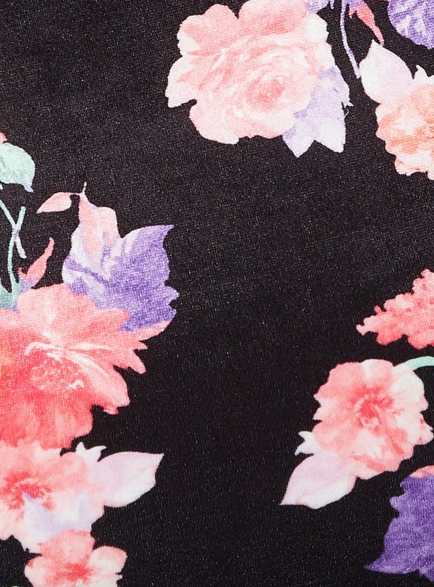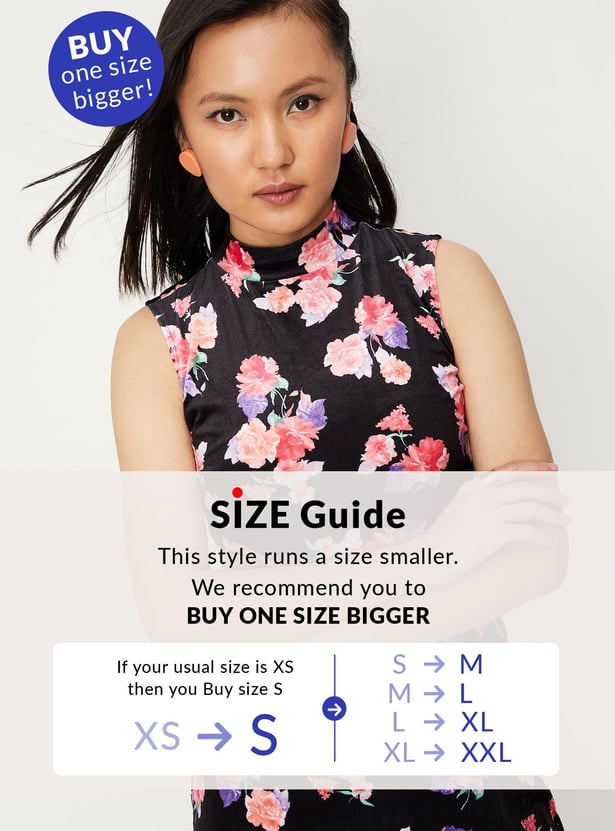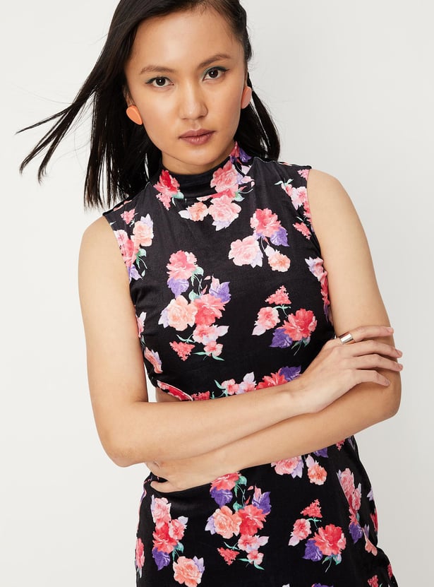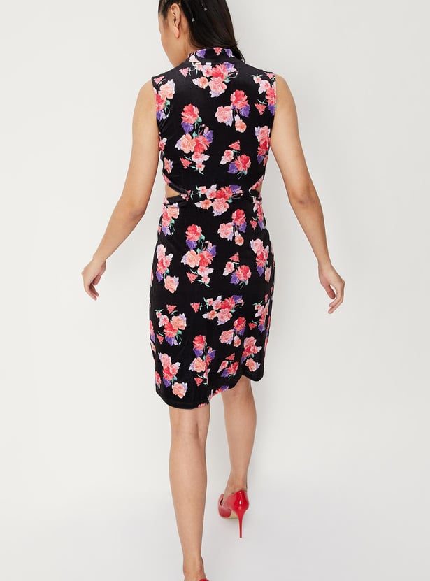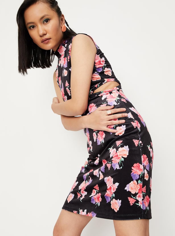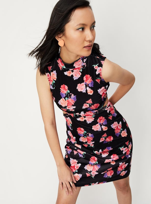 Amp up your fashion quotient in this floral printed dress that features a high neck with cutout details and a mini length in a bodycon style.