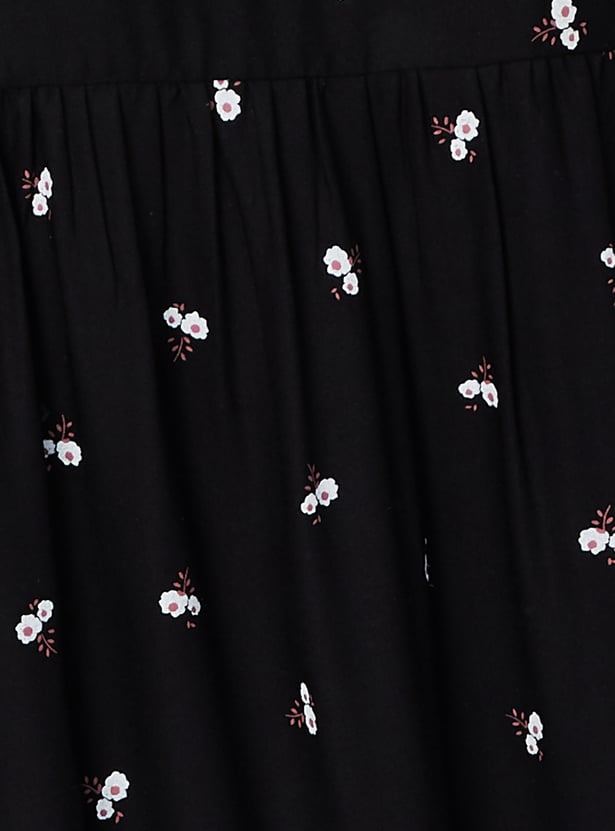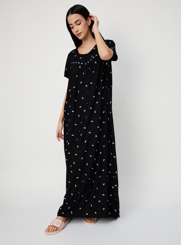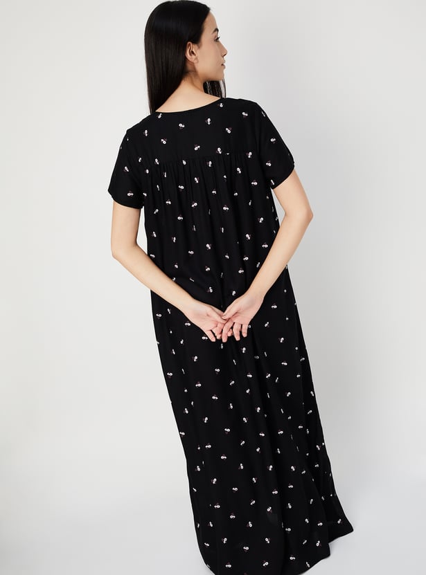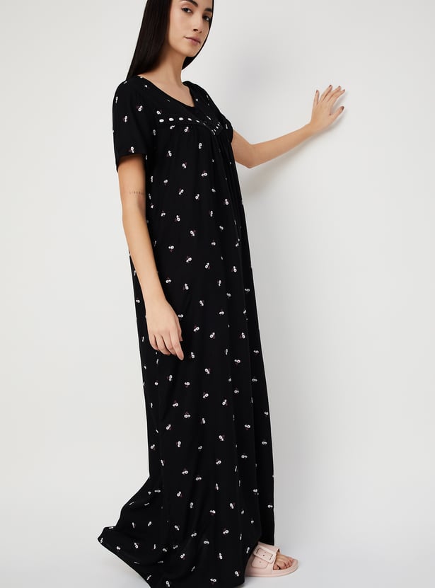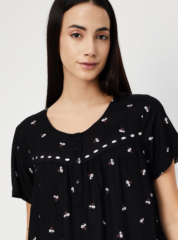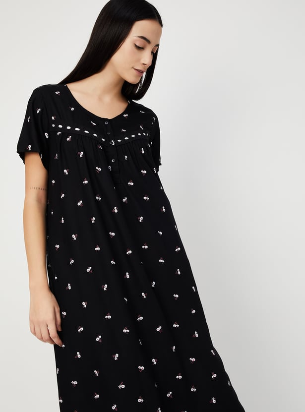 Get a good night's sleep by relaxing in this nightgown. It features all-over floral prints, a round neck, short sleeves, a lace detail at the yoke, and a button closure.