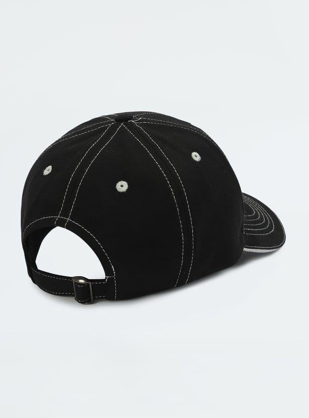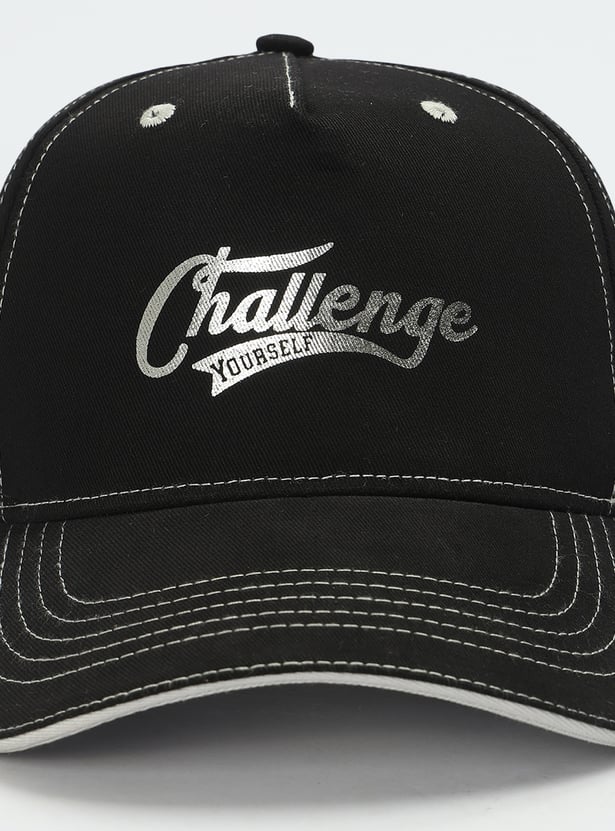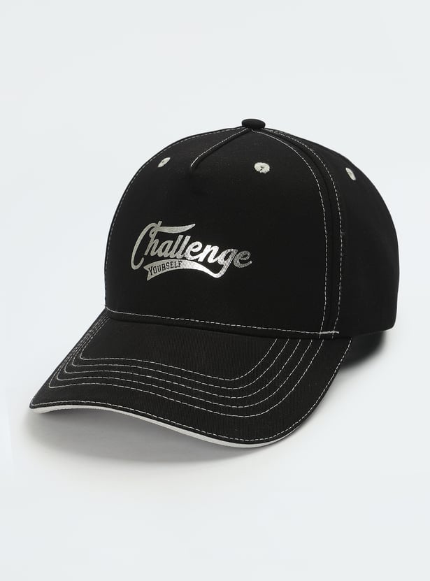 Shine on with this denim baseball cap. The features include contrast stitching, eyelet panels, and a button accent on the top. The foil prints add a splash of modern elegance.