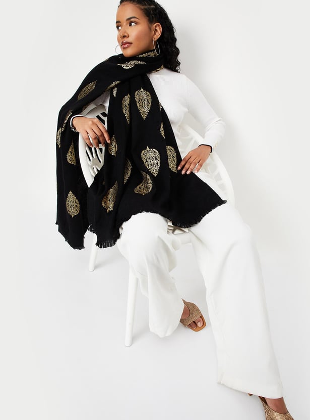Embrace the season in style with this shawl. It features foil printed design with fringes at the ends. To add a touch of warmth to your outfit, layering this shawl with an ethnic top and palazzos.