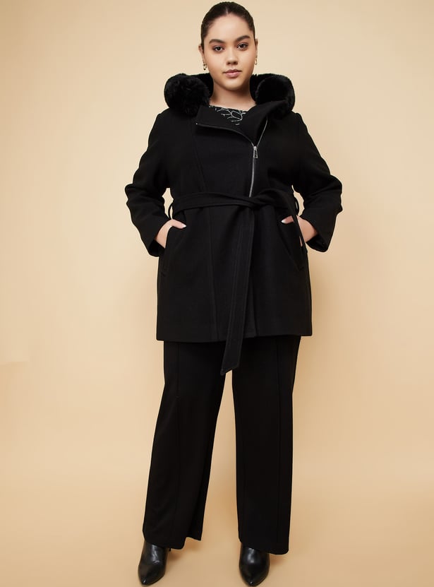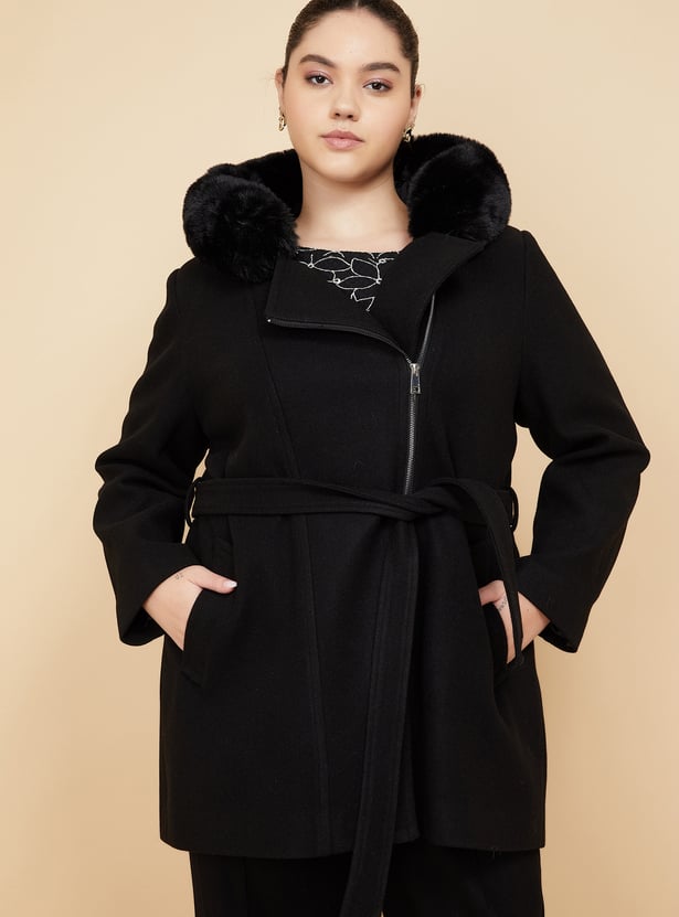 Stay warm and stylish with this fur hood longline jacket, featuring full sleeves, a zip closure, pockets, and a tie-up waist for a flattering, adjustable fit.