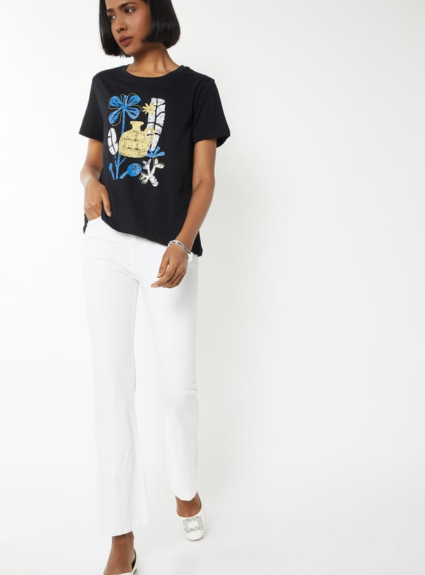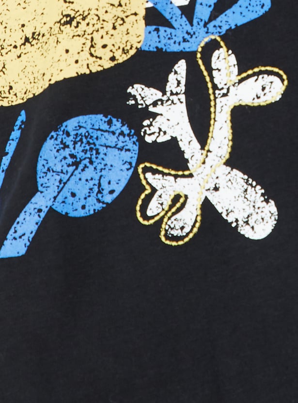 This printed t-shirt adds a charming touch to your everyday style with its soft prints and classic silhouette. Featuring a round neck and half sleeves, it's perfect for easy, all-day comfort.
