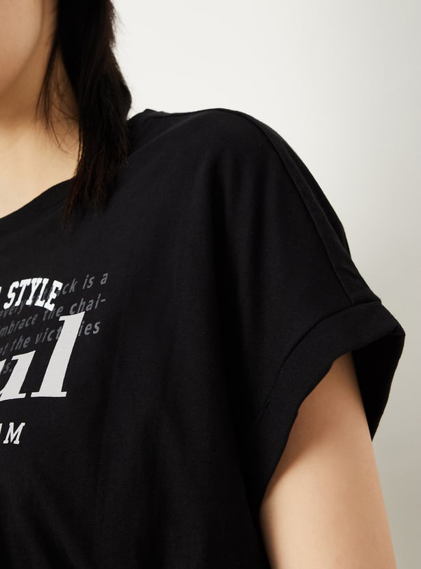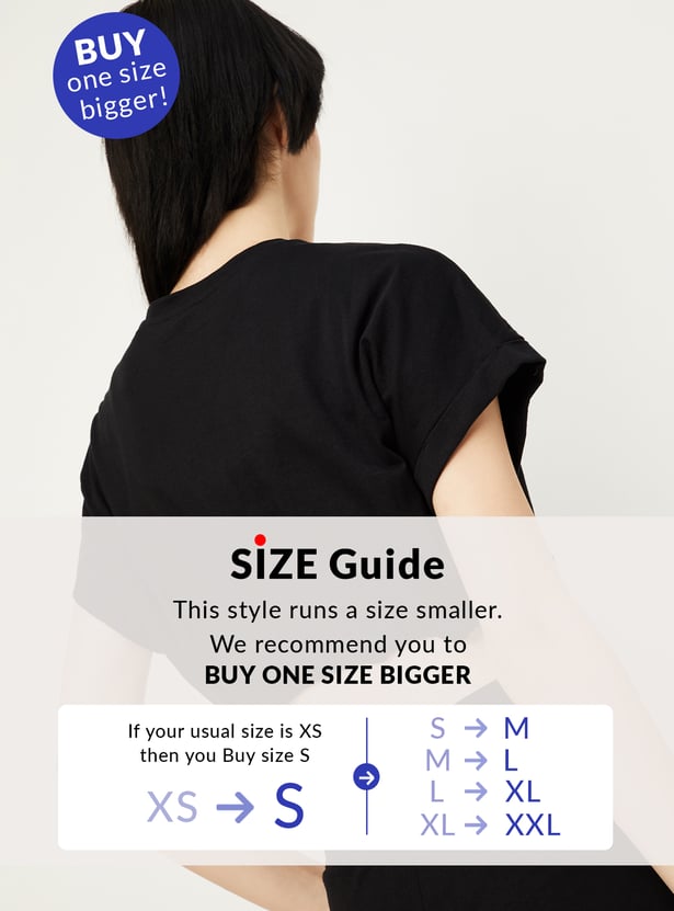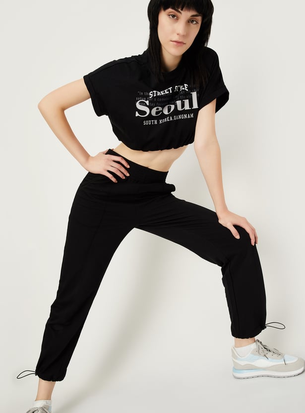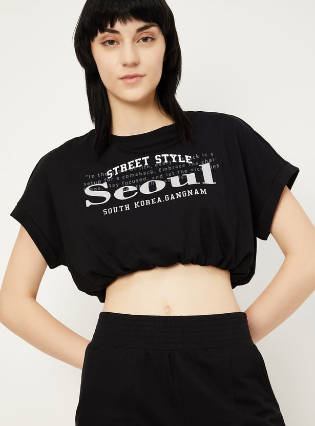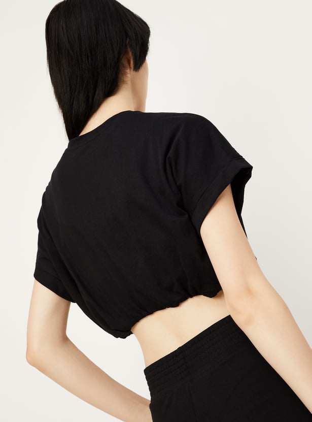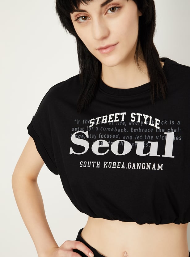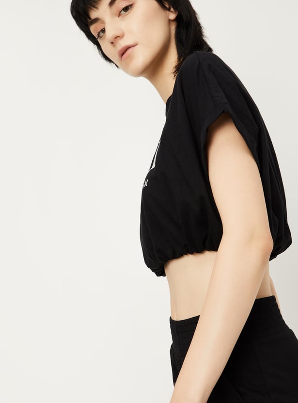 Slay your workout look in this T-shirt crafted in a crop profile. It features a graphic chest print, a round neck, and short sleeves with elasticated hemline.