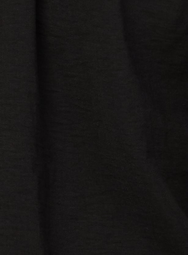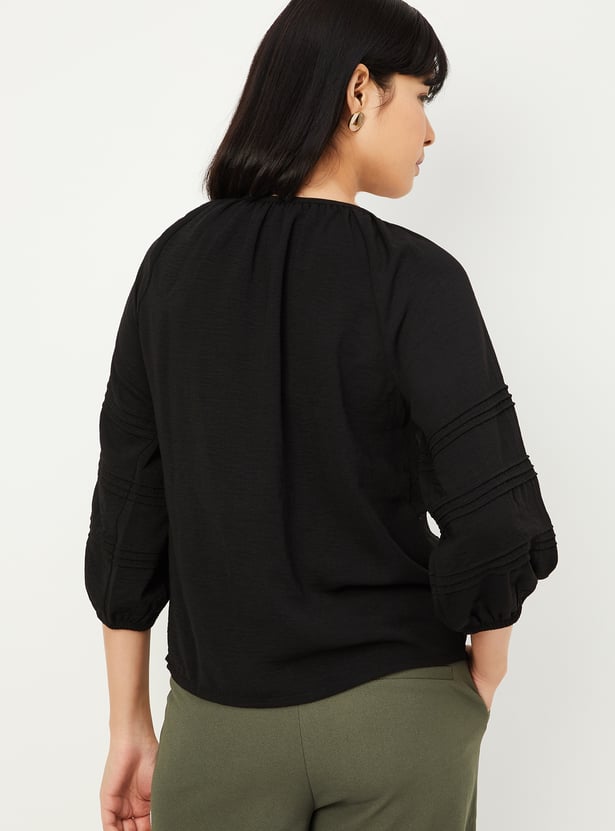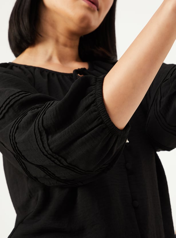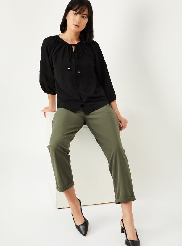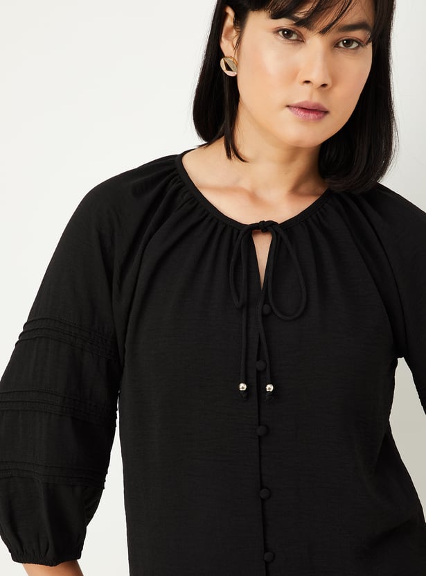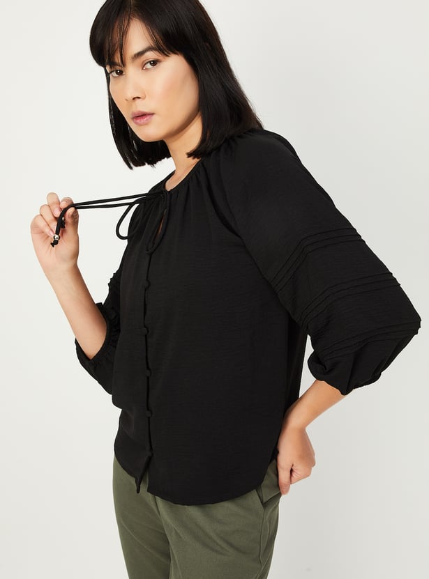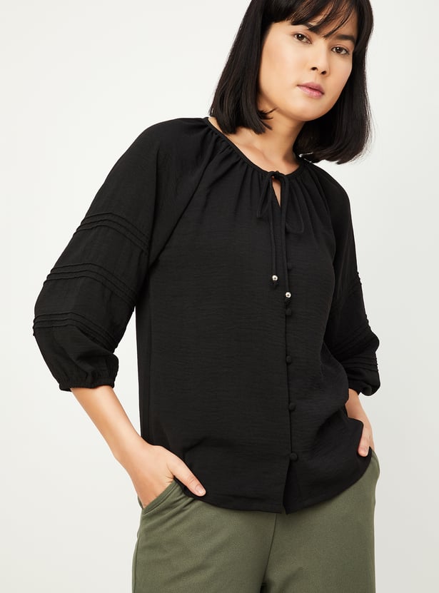 Embrace modern elegance with this blouse. The hammered design adds to the visual appeal. It has a tie-up neck, raglan sleeves with pintuck detailing, and a front button placket. Model Size :