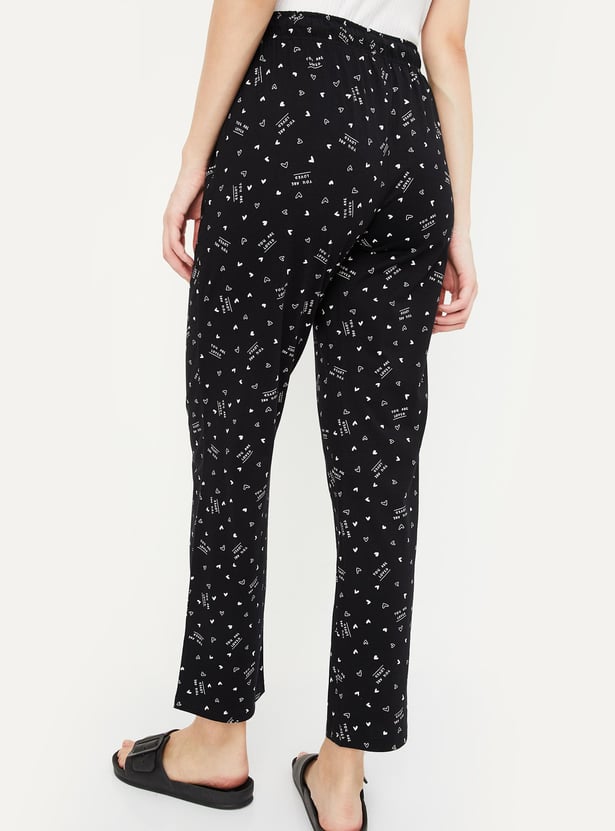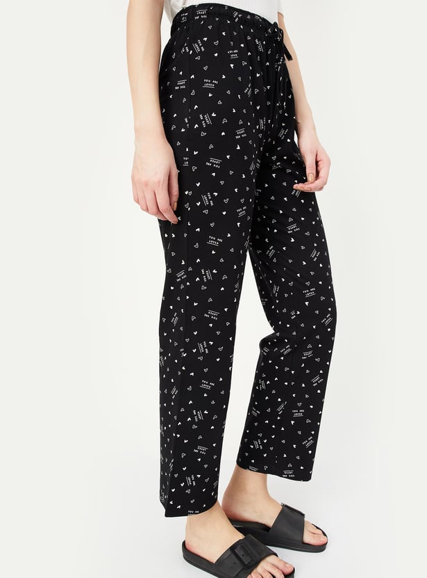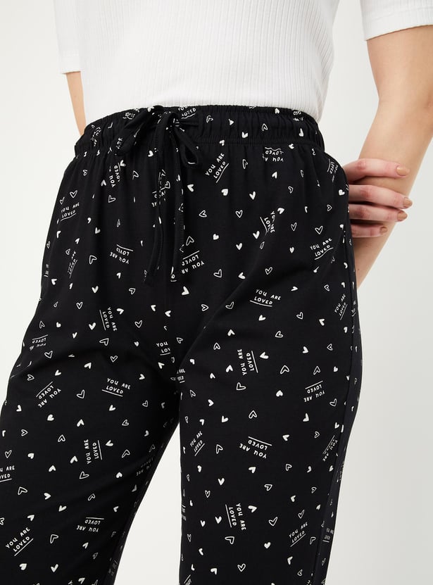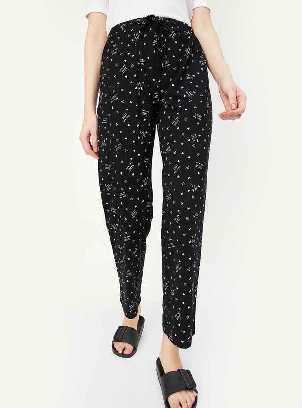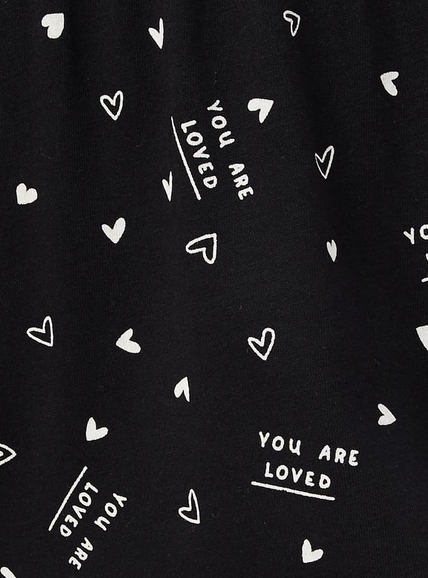 Stay comfortable and stylish all day with this pair of pyjamas. It features heart prints all over, a drawstring closure, and a full-length construction. Model Size :