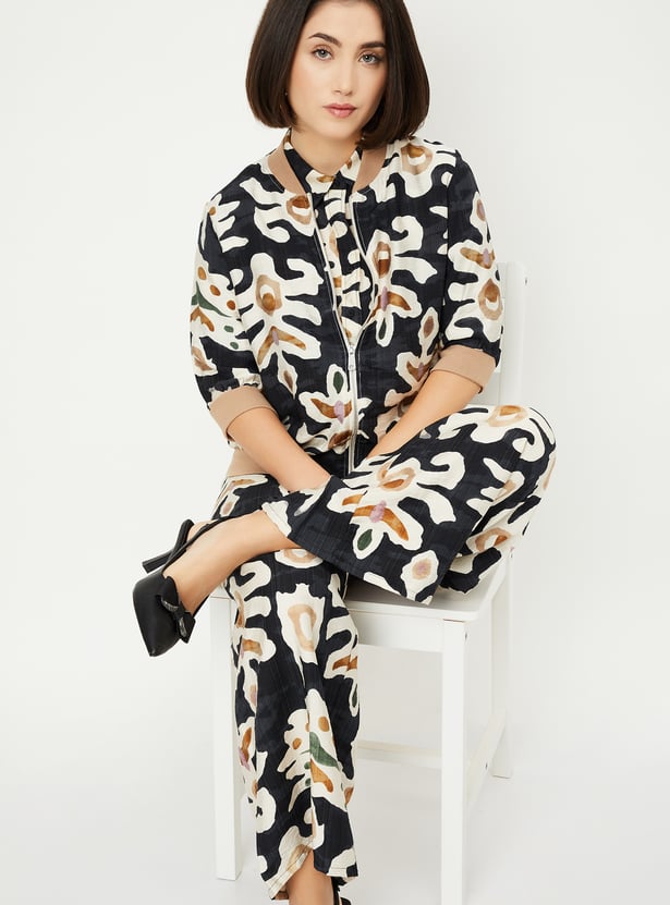 This ikat printed top features a sporty baseball collar and a sleek zip closure at the front, adding a touch of modern flair to your wardrobe. The half sleeves keep it comfortable and stylish for any casual outing.