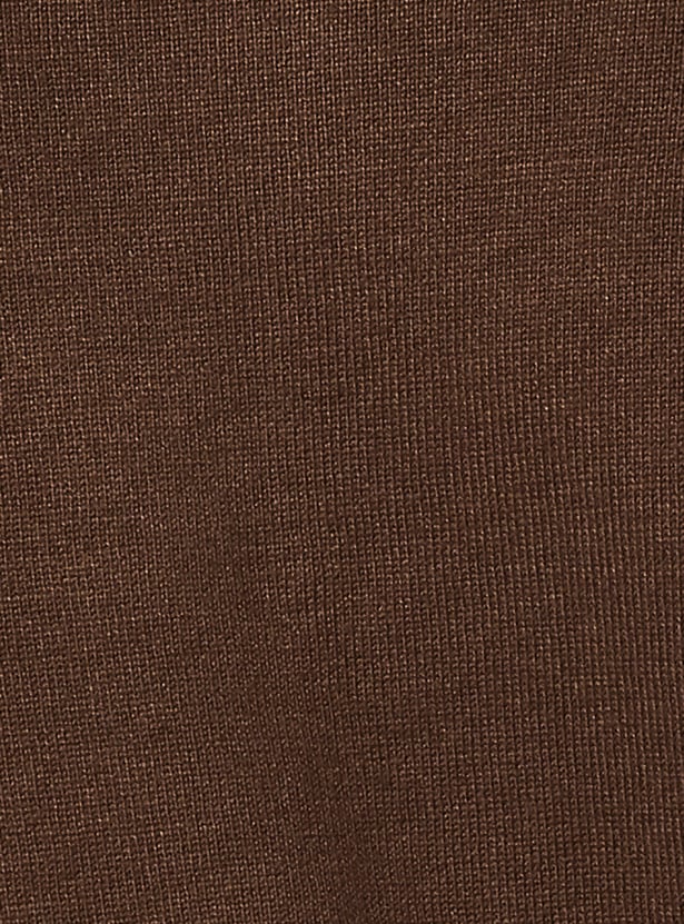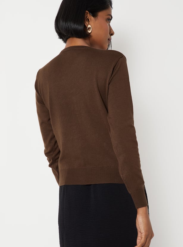 Layer up in style with this chic knit cardigan. Designed with a round neck and full sleeves, it offers cosy comfort for everyday wear. The ribbed trim ensures a neat fit, while metallic buttons and faux pockets add a refined touch.