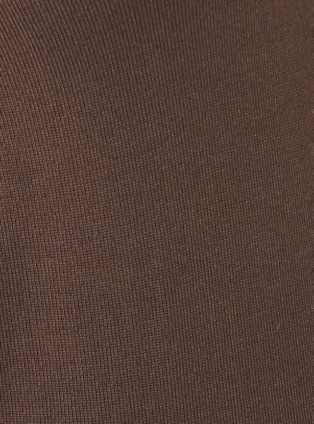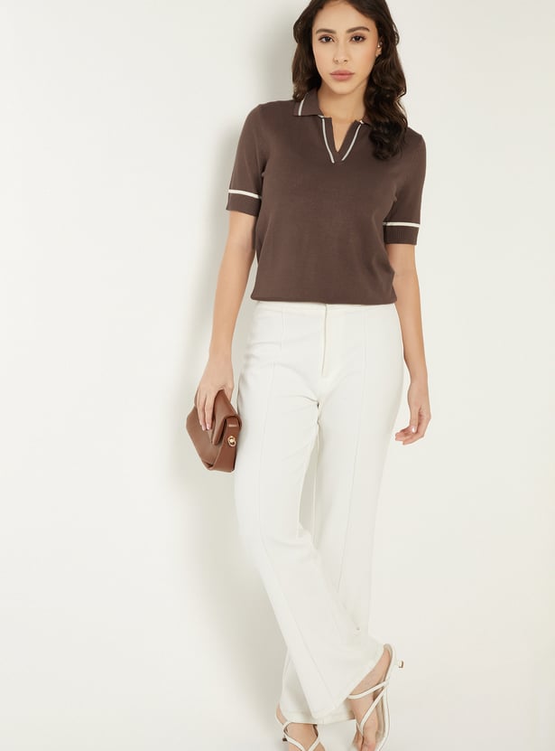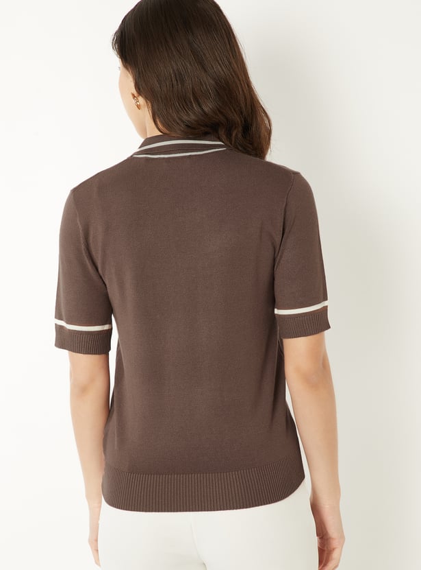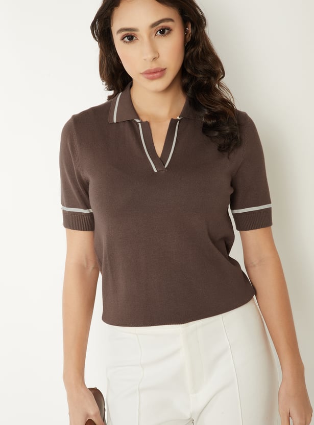 This solid knit T-shirt features a chic Johnny collar neck, contrast lining, and half sleeves with ribbed hems for a polished yet easygoing look. Its structured knit and clean detailing make it a stylish upgrade to everyday essentials.