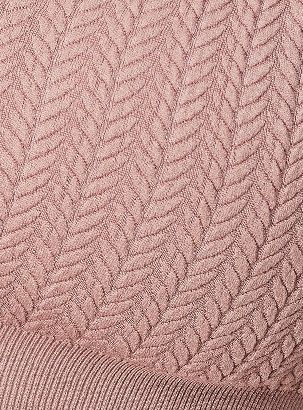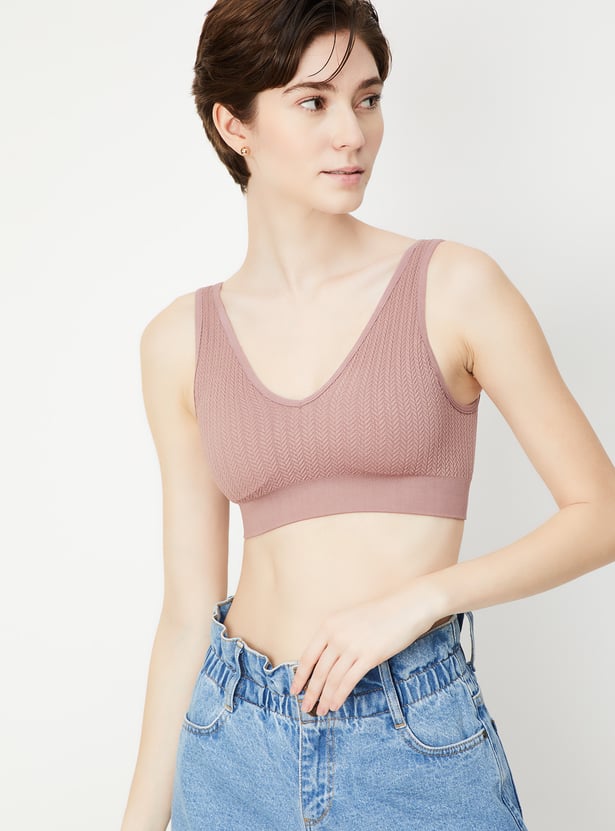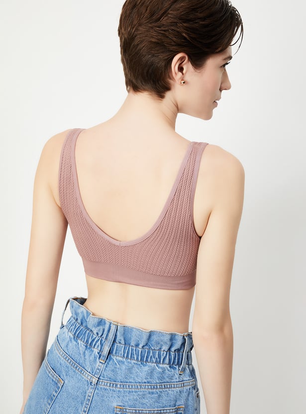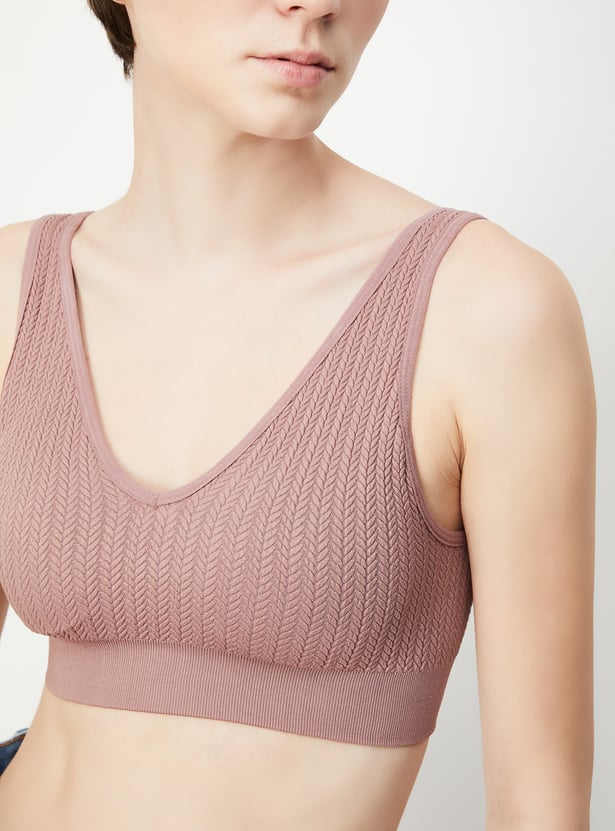 Support combines with comfort with this sports bra. The knit pattern lends a cosy look. It has a V-neck and elasticated hem.
