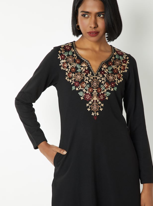 This knit straight kurta is designed for effortless everyday style, featuring a notch neck, full sleeves, side slits, and a functional side pocket. Its clean silhouette and soft knit fabric offer both comfort and versatility for all-day wear.