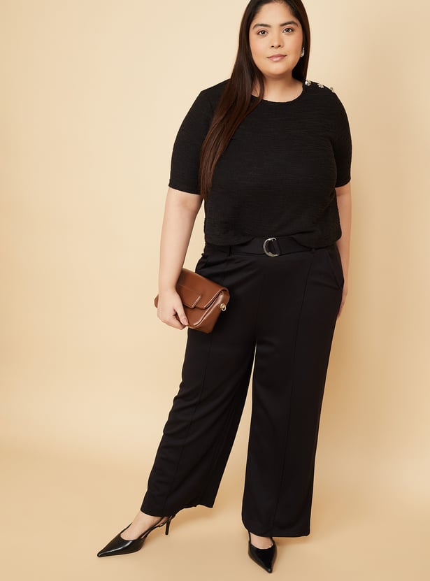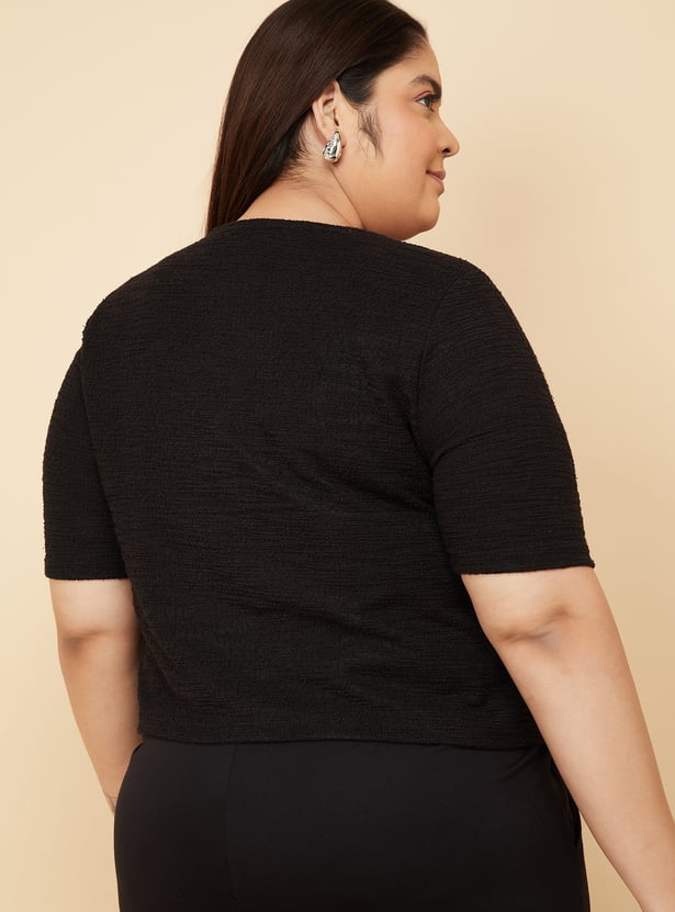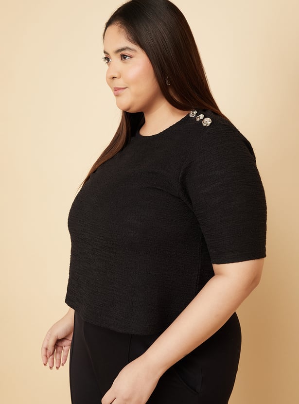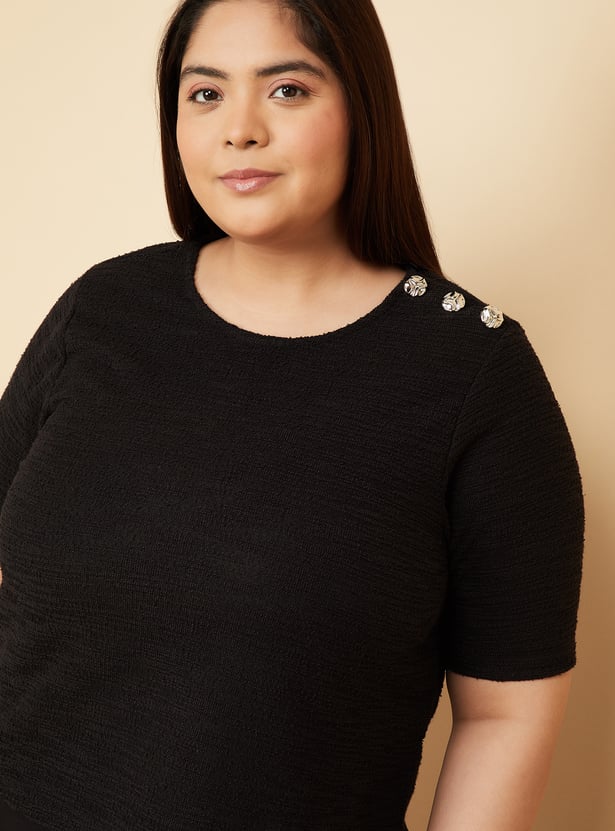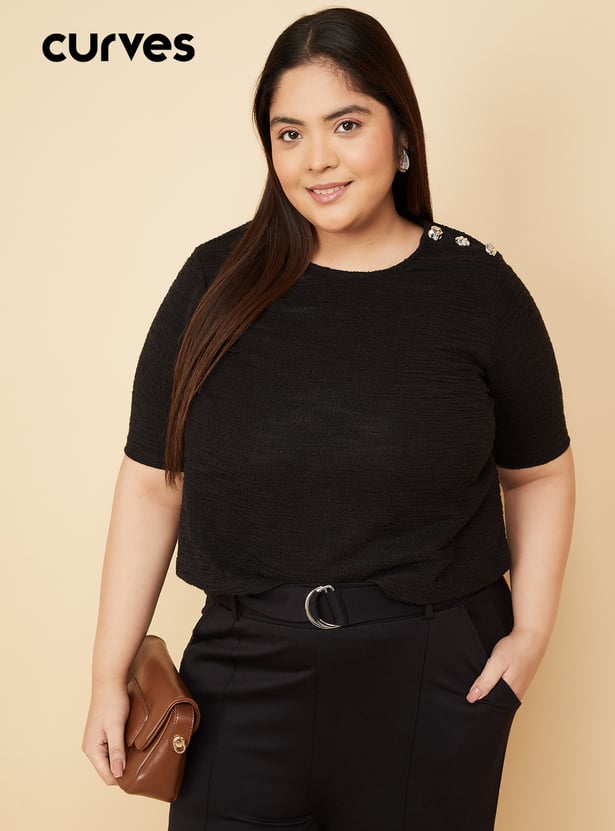 Keep it simple yet chic with this knit top, featuring a round neck, half sleeves, and button detailing on the shoulder. Soft and comfortable, it adds a subtle touch of style to your everyday wardrobe. Model Size :
