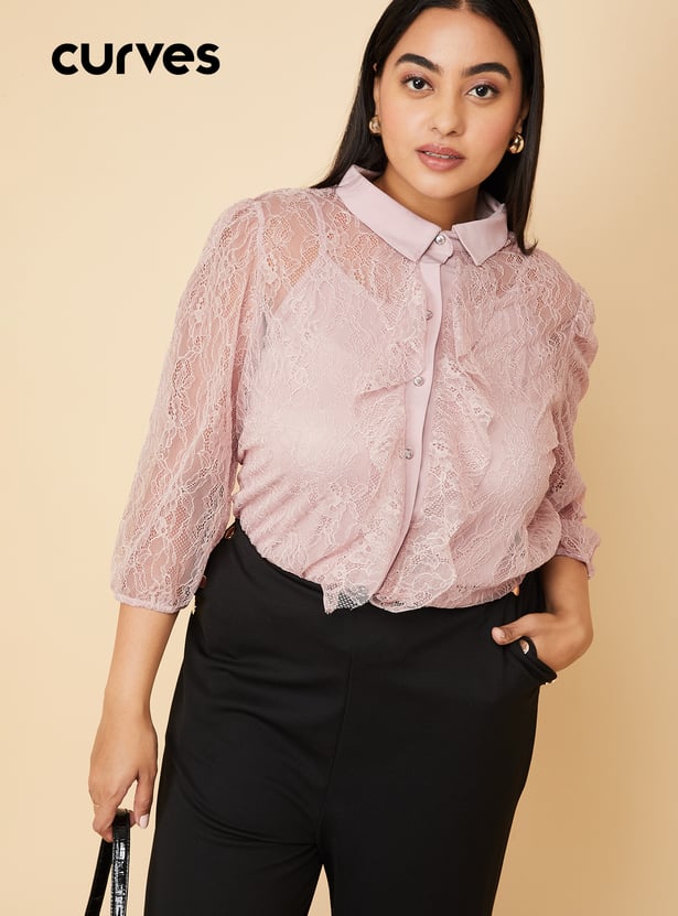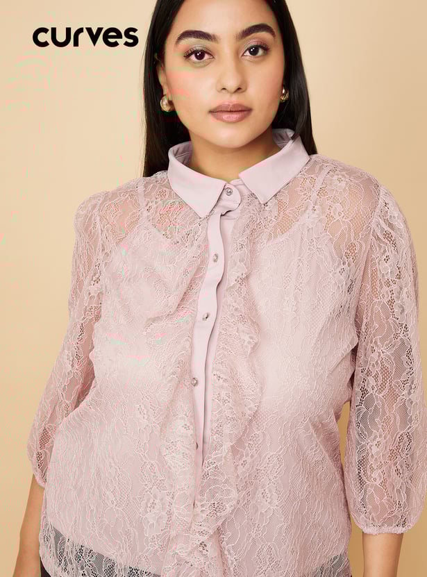 Elevate your outfit with this exquisite blouse. Boasting a spread collar neckline adorned with ruffles, a delicate lace bodice, three-quarter sleeves, and a button front, it exudes sophistication. Complete with a matching camisole for added versatility. Model Size :