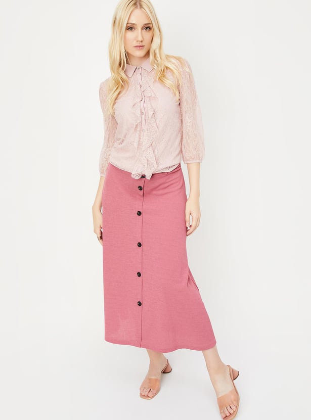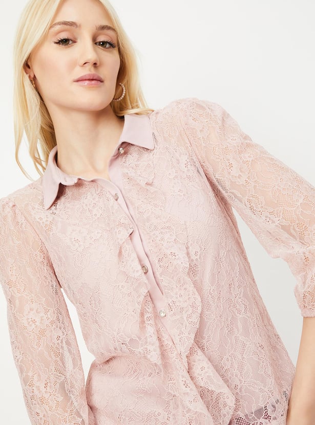Enhance your attire with this blouse that features a spread collar detailed with ruffles, a lace bodice, three-quarter sleeves, and a button-up front. It also includes a coordinating knit camisole to complete the look.