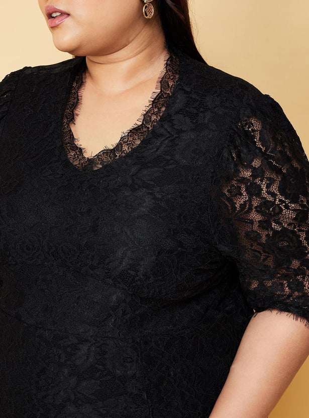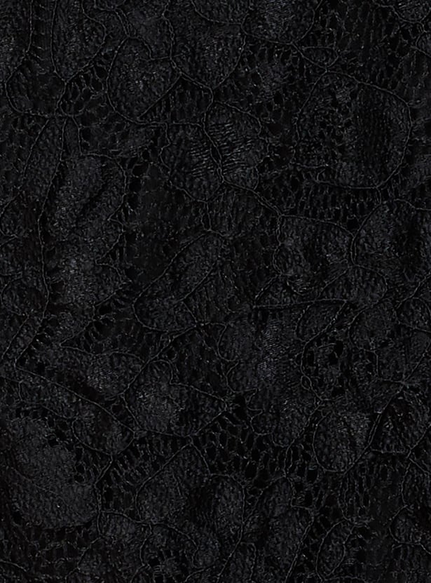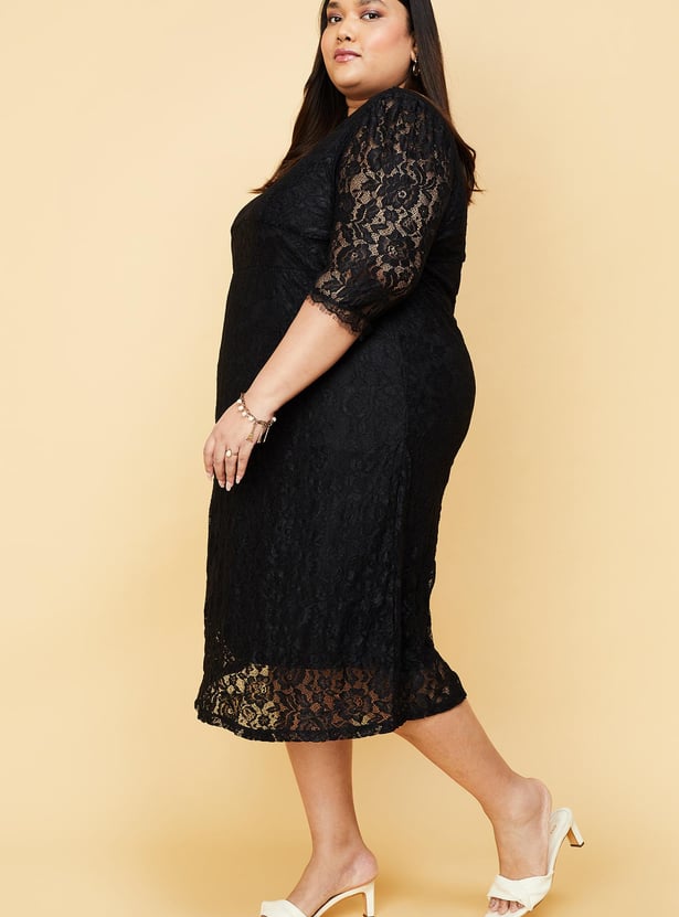 A perfect mix of dainty and chic, this fit and flare dress is updated with a lace overlay. It features a scalloped neck, three-quarter sleeves, eyelash trim, and a midi-length profile Pair this dress with block heels and a sling bag for an elevated look.