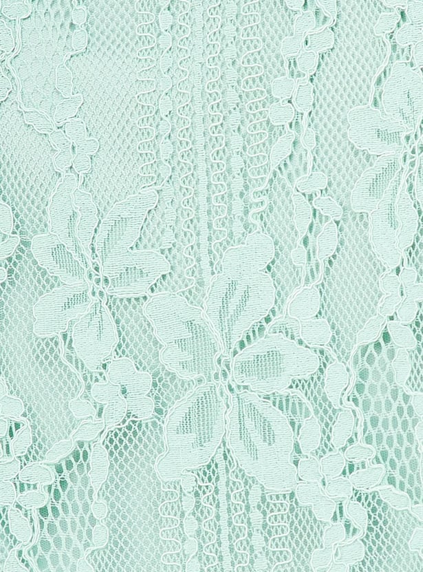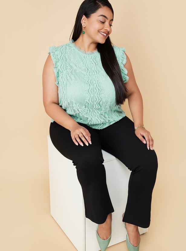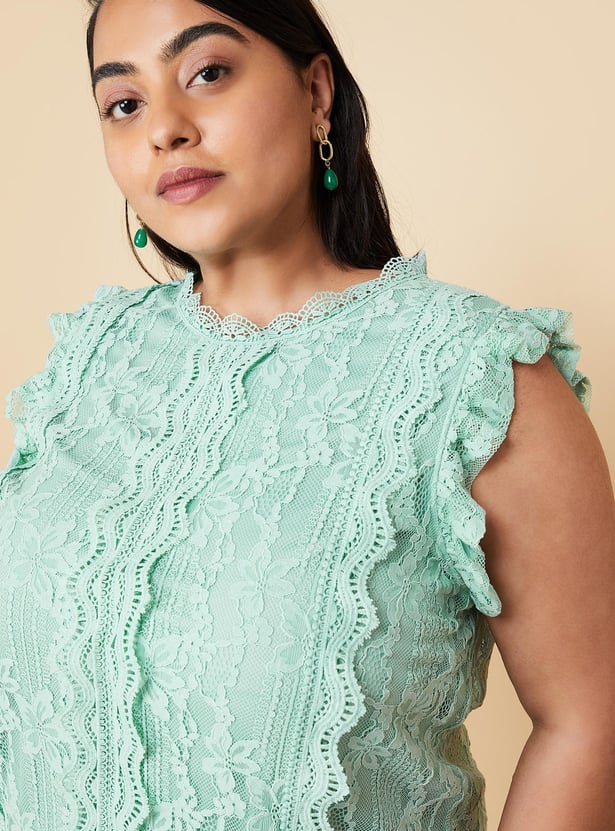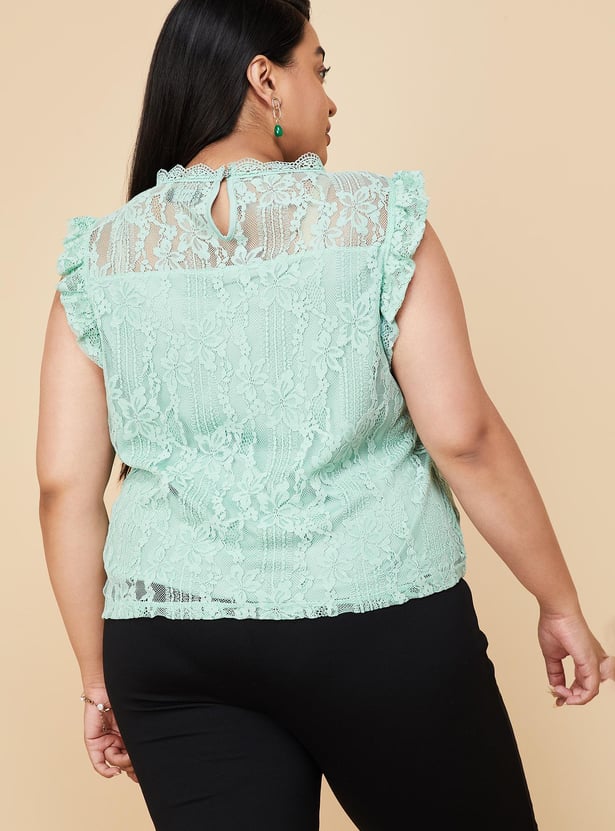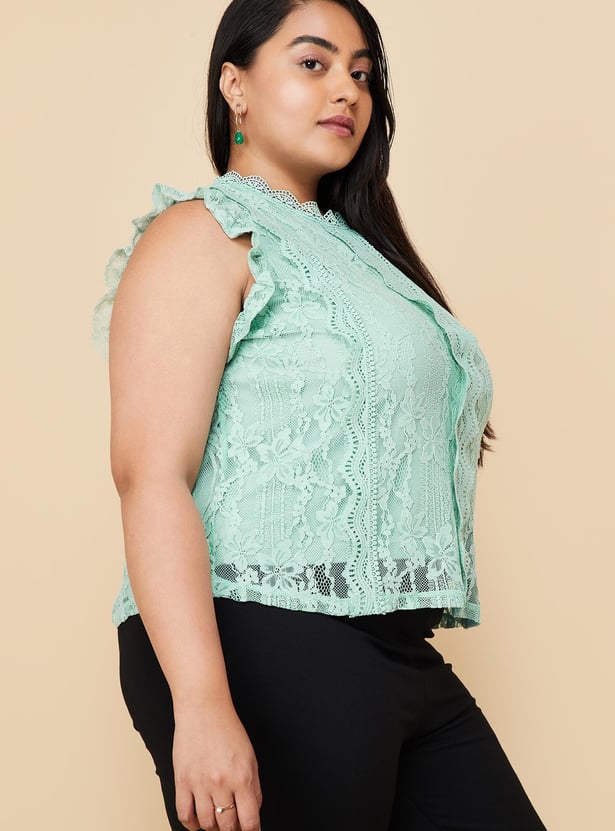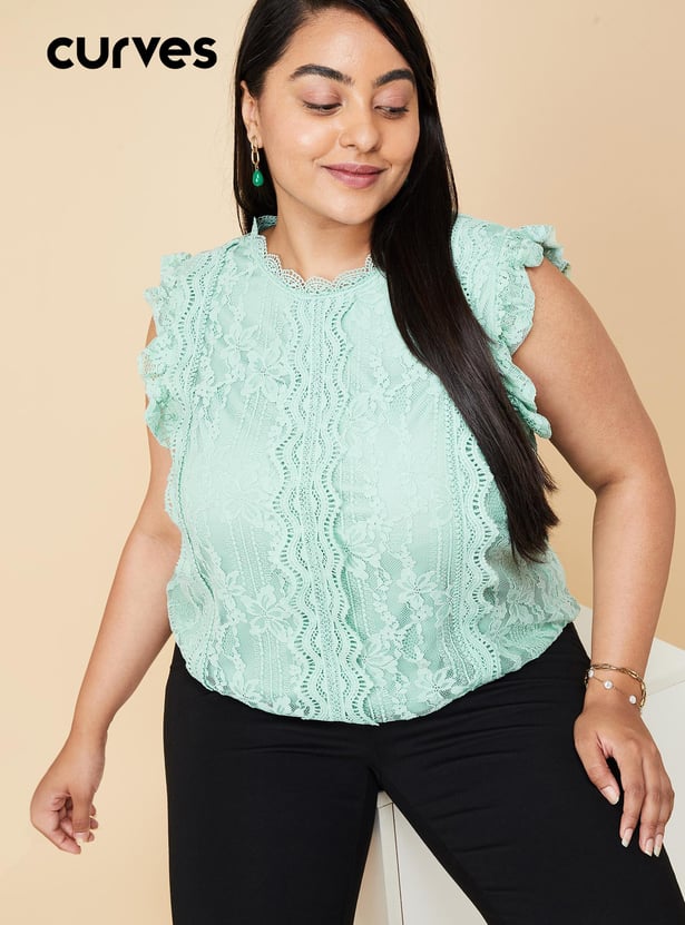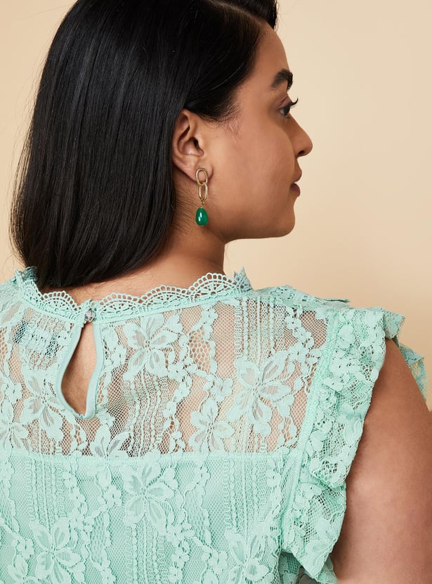 Elevate your ensemble with this elegant top featuring a lace overlay, a round neckline adorned with scalloped lace, sleeveless construction, and a back button closure with a keyhole detail.