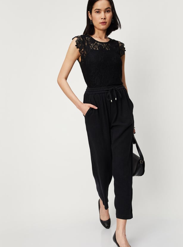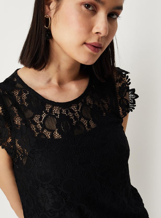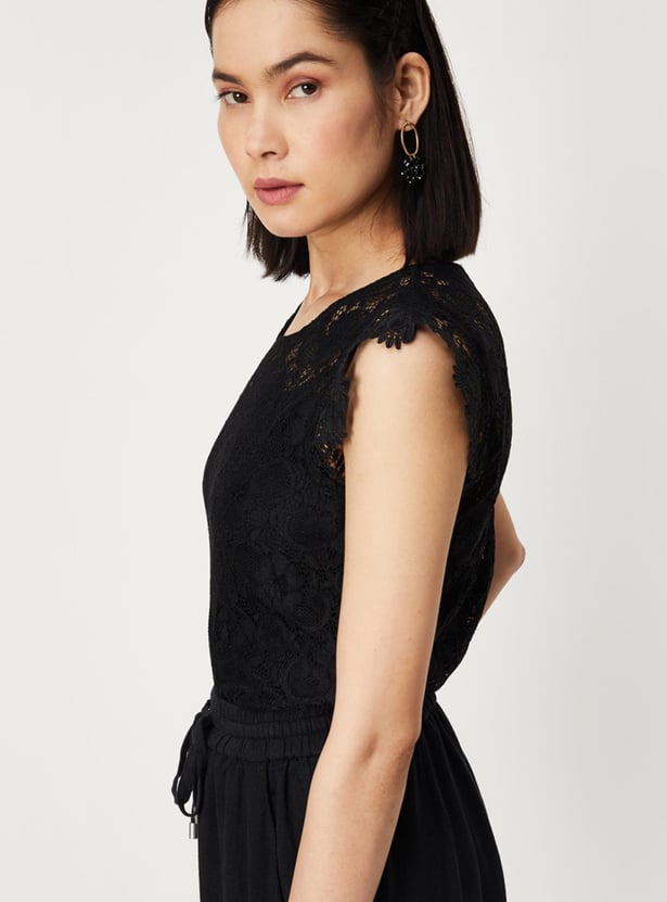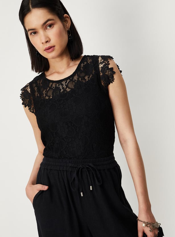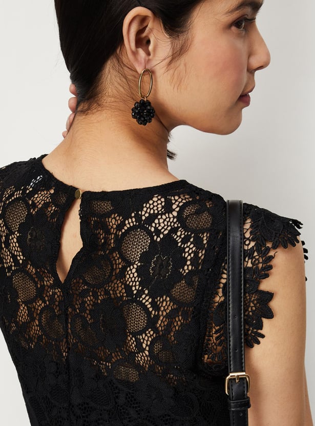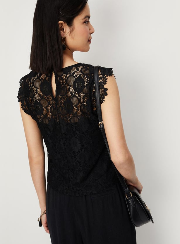 Dress up your 9-5 look with this top. It features a lace overlay with a round neckline, sleeveless construction, and a back button closure with a keyhole. Tram up this top with trousers and ballerinas to ace the look.