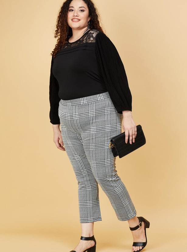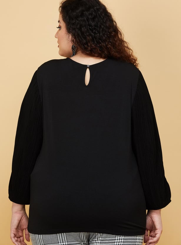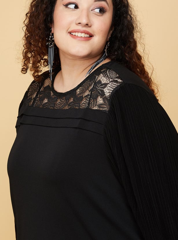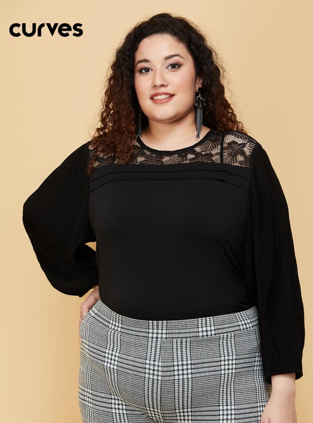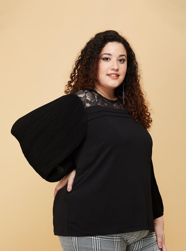 A lace inset yoke accentuates the look of this top featuring a high neckline and textured sleeves.