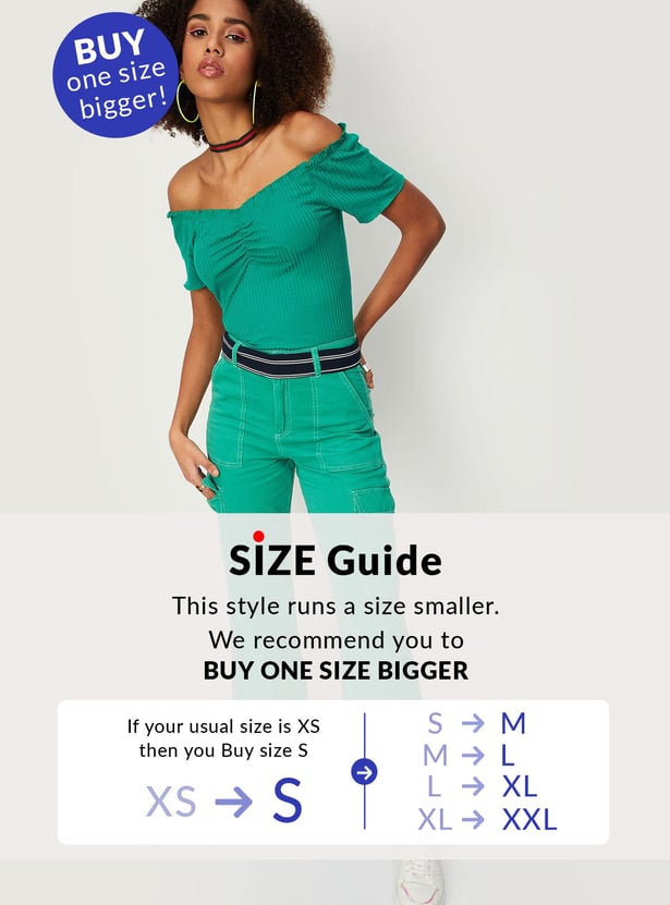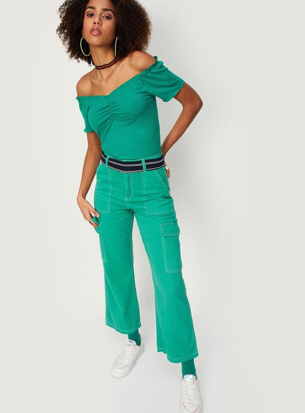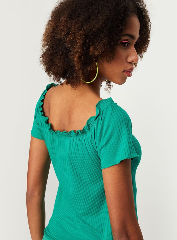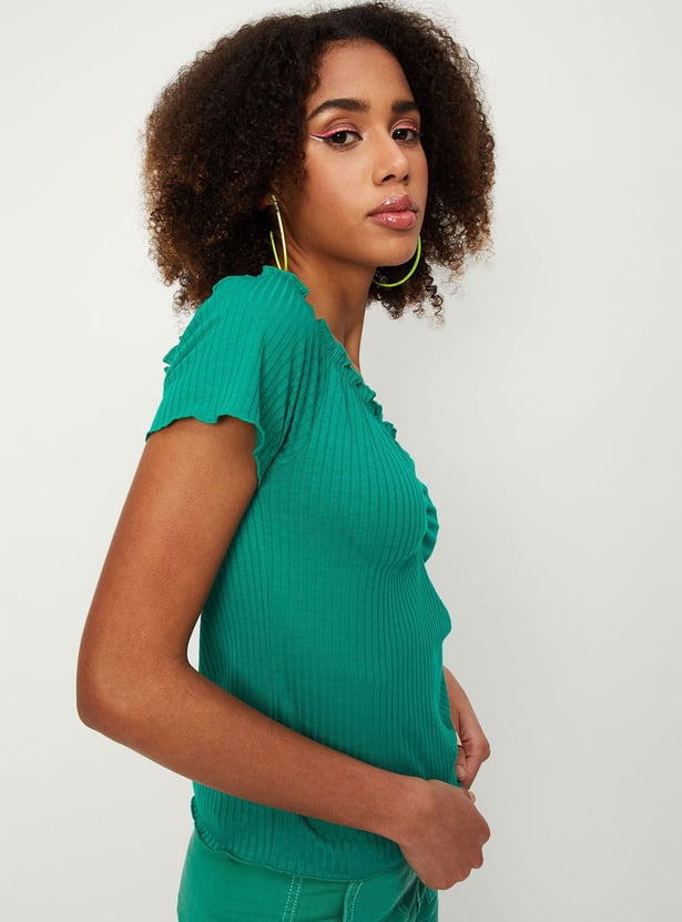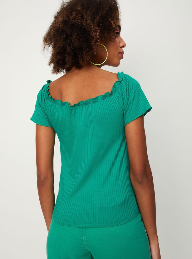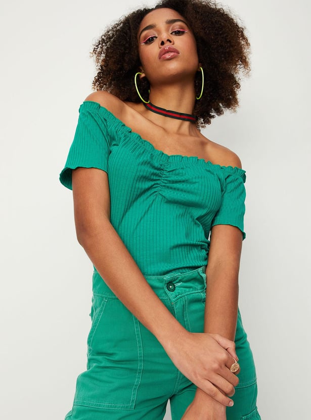 Amp up your style with this top that is highlighted with a textured knit pattern. it features an off-shoulder neck, short sleeves, and lettuce-edge trim. Style the top with a skirt and sneakers to ace the look.