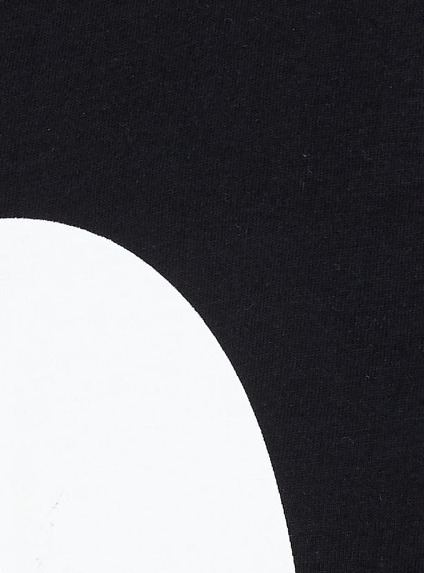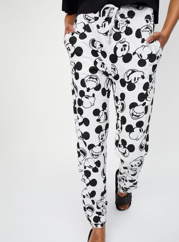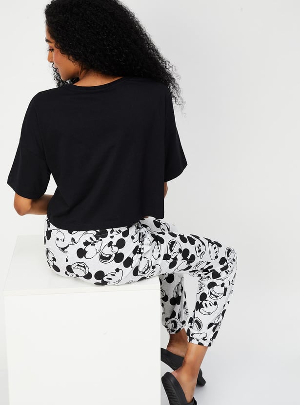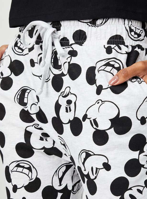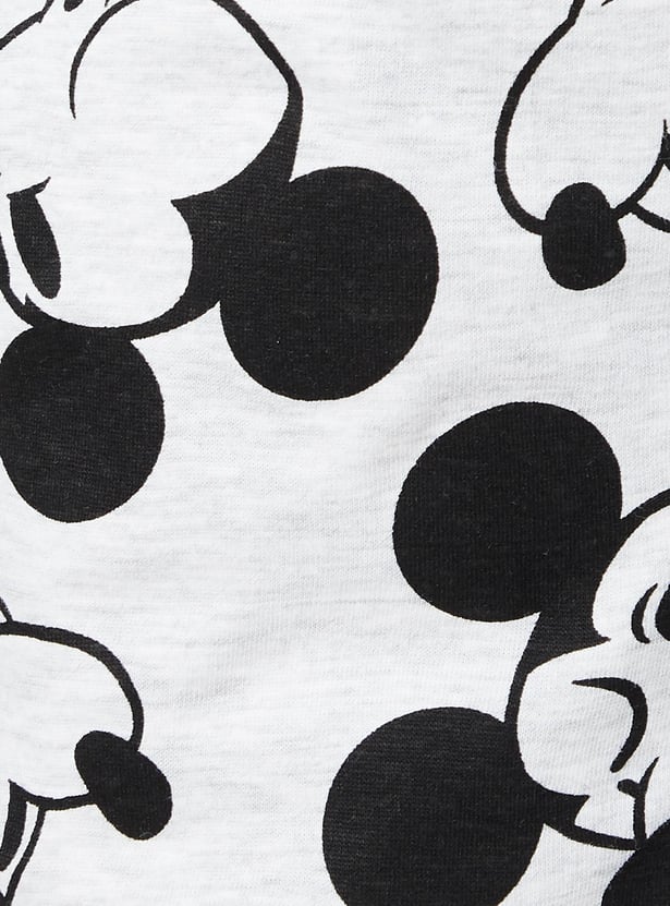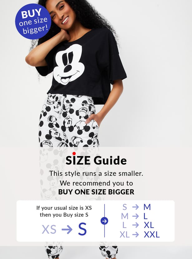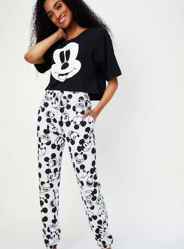 Lounge around in comfort like this sleepwear set. It features a Mickey Mouse print T-shirt with a round neck and full sleeves. The pyjamas feature all-over print, a drawstring waist, and a full-length profile.