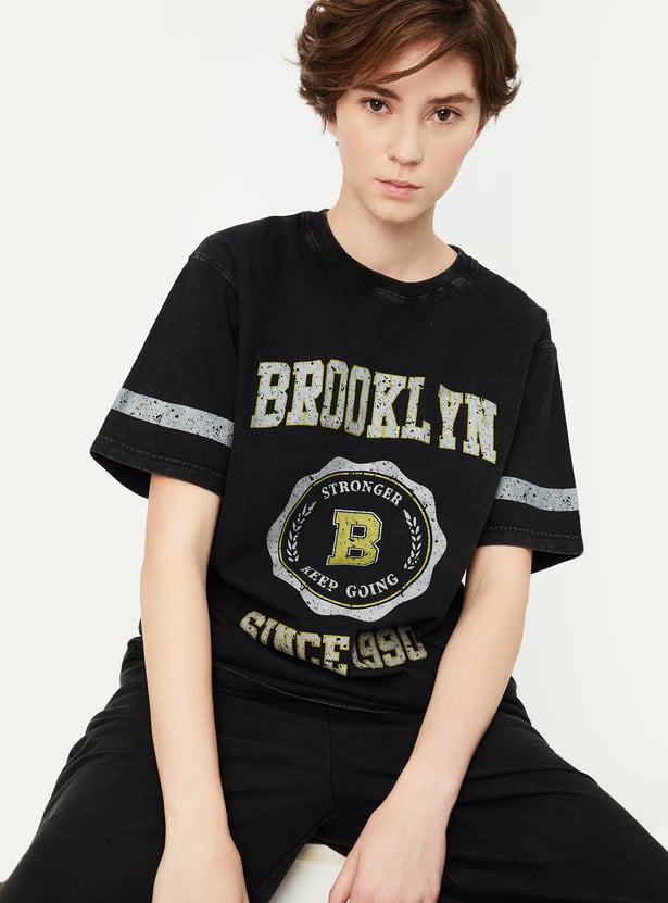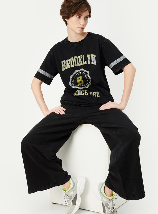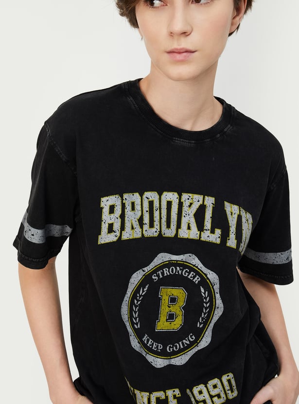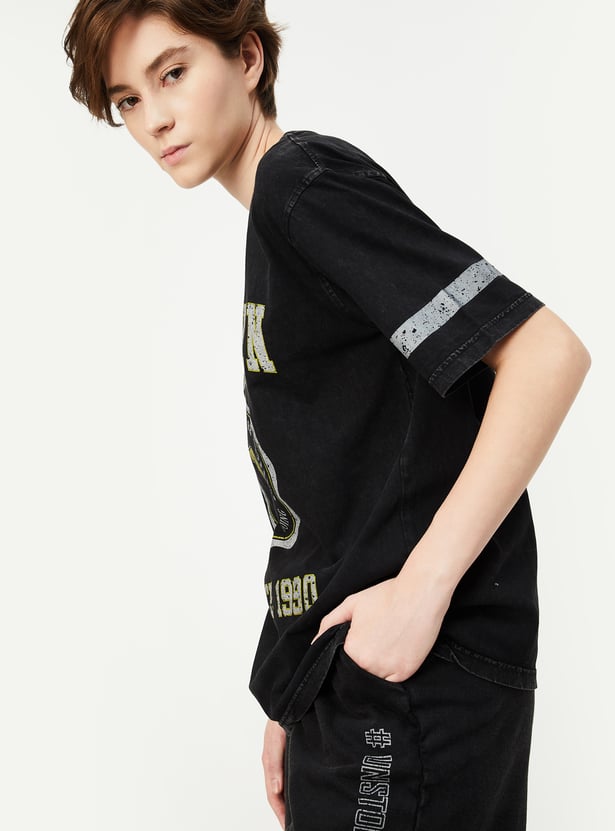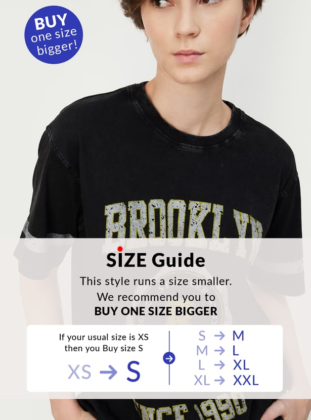 A versatile piece that combines effortless comfort and style, this T-shirt is sure to become a wardrobe favourite. It features a round neck, half sleeves, and an oversized profile for roomy comfort. The acid wash finish gives a vintage-inspired look.