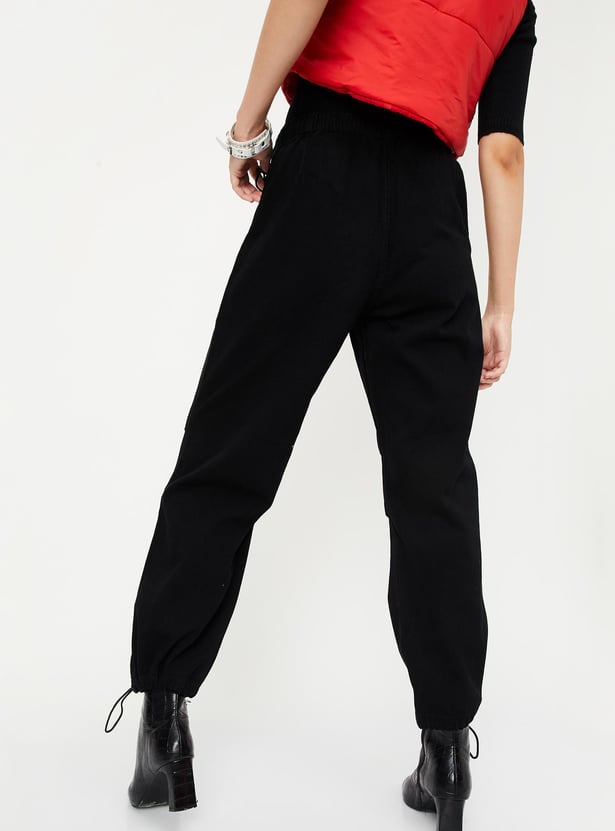 Upgrade your denim game with this pair of jeans rendered in a solid tone. It features a drawcord elasticated waist, side pockets, and drawcords at the hem to create the parachute fit. This pair of jeans looks best with a tee and boots.