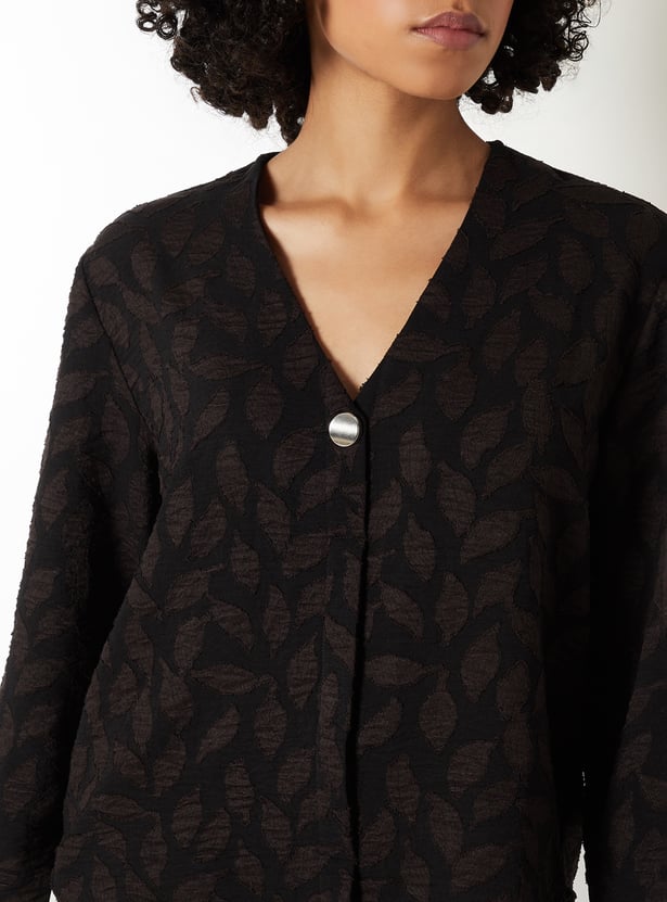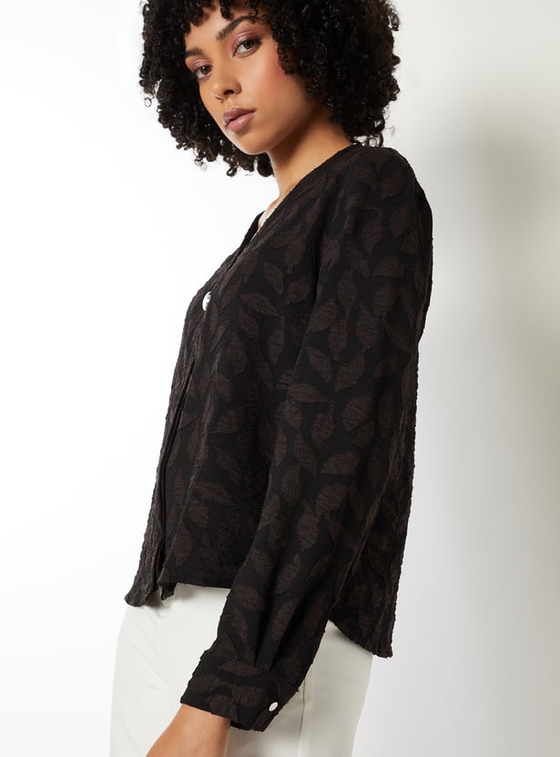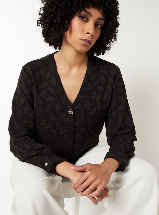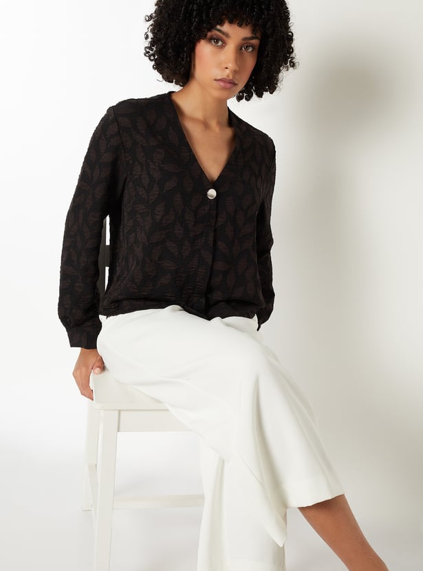 These patterned blouse features a v-neck, button placket, and full sleeves, offering a clean and elegant silhouette. The subtle pattern adds depth, making it a versatile piece for both casual and polished looks. Model Size :