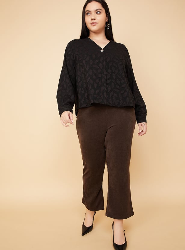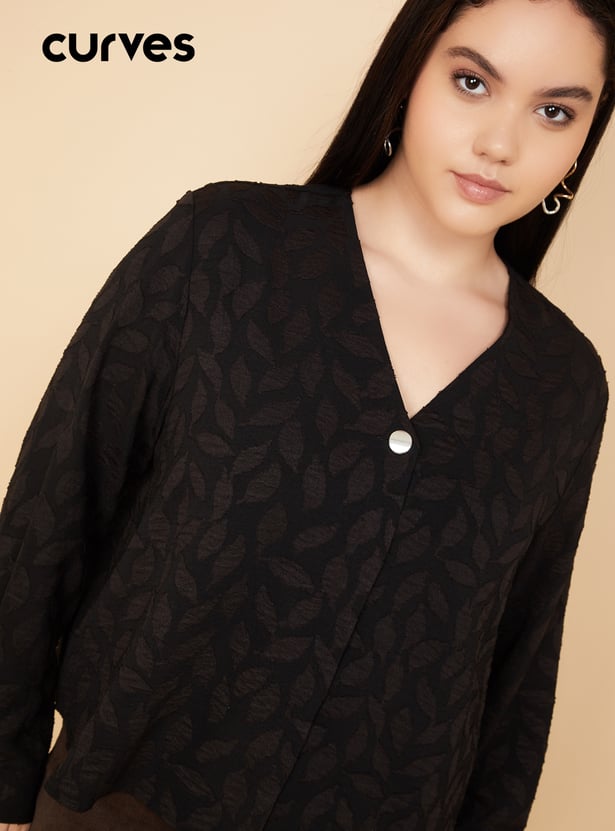 These patterned blouse features a v-neck, button placket, and full sleeves, offering a clean and elegant silhouette. The subtle pattern adds depth, making it a versatile piece for both casual and polished looks. Model Size :