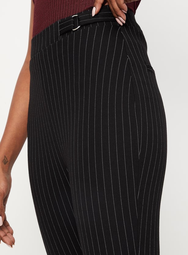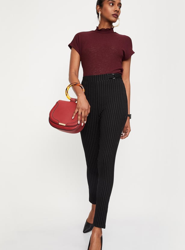 Make a classic statement with this pair of treggings. It is designed with pinstripes, a D-ring with an adjustable tab at the waist, and flat front, and back welt pockets. Tuck in a top in this pair of trousers and style with a pair of stiletto pumps for a sophisticated style.