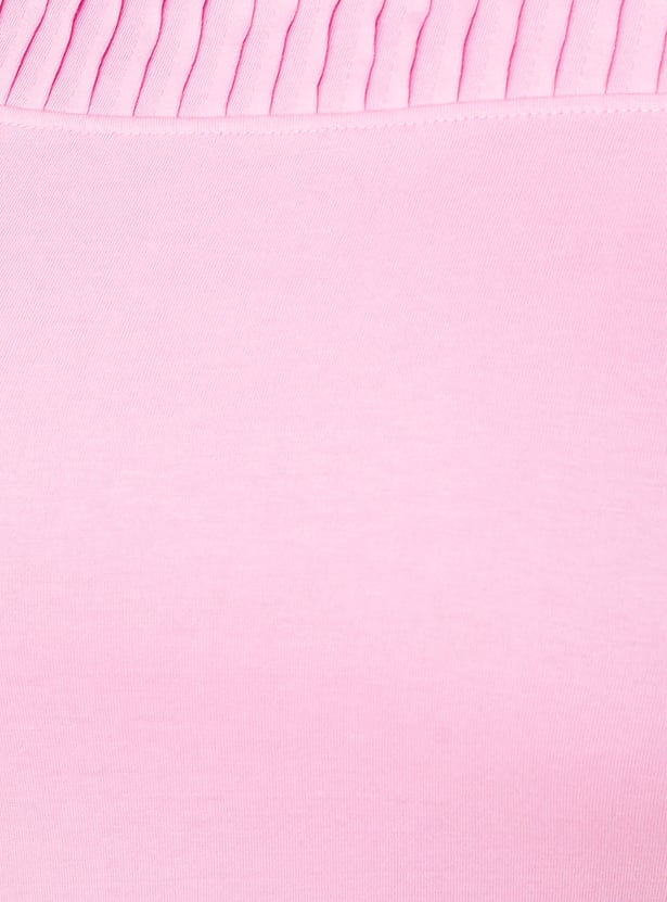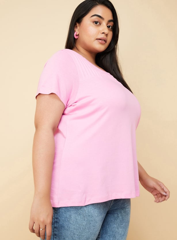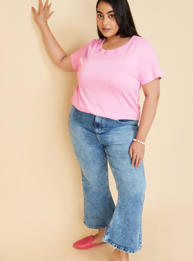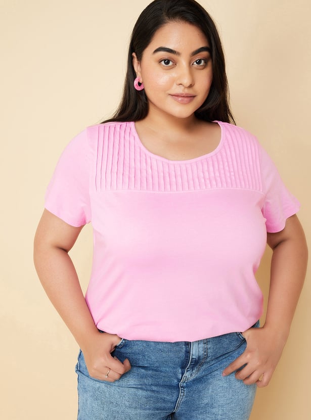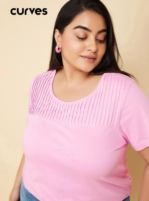 Upgrade your wardrobe with this T-shirt featuring a pintuck yoke. It is designed with a round neck and half sleeves.