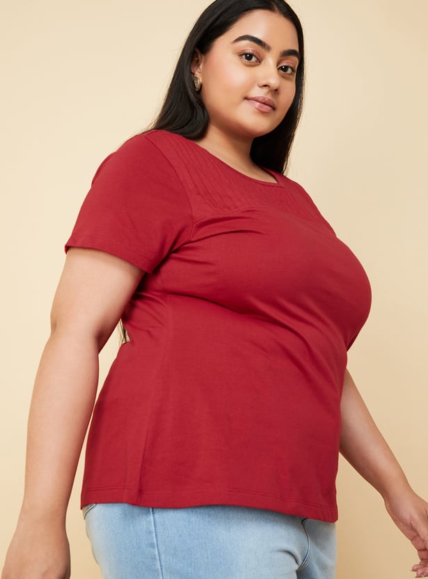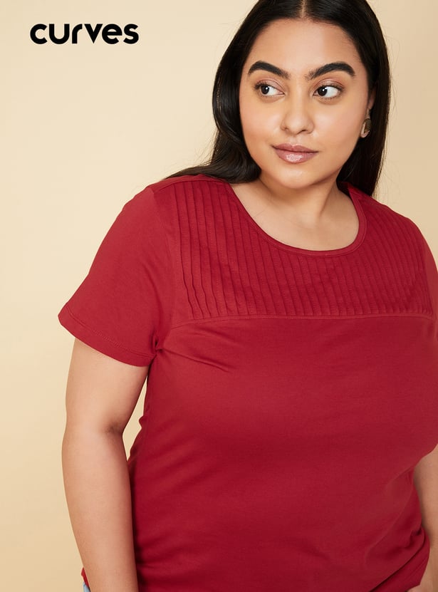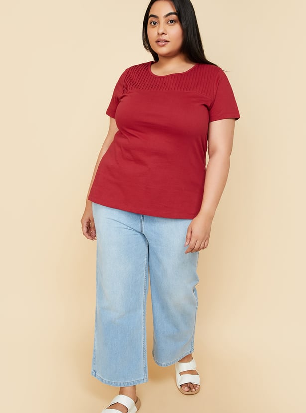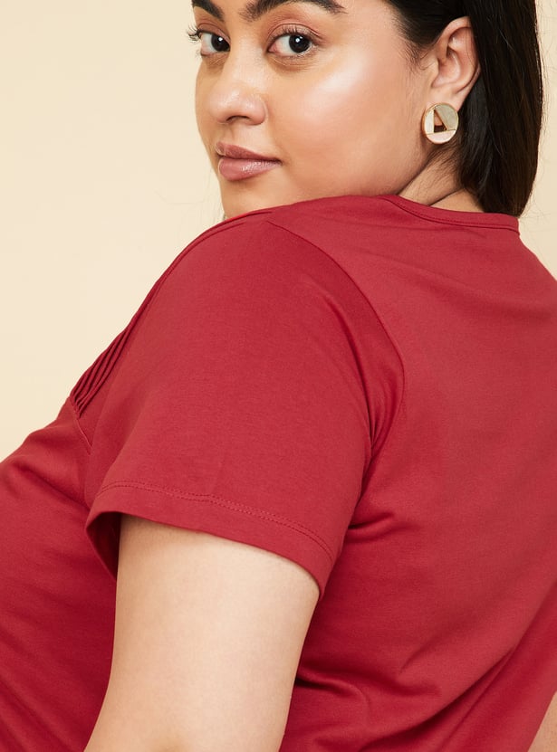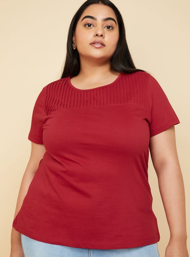 Upgrade your wardrobe with this T-shirt featuring a pintuck yoke. It is designed with a round neck and half sleeves.