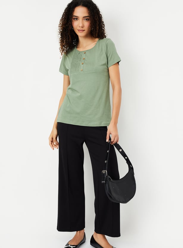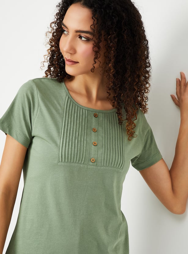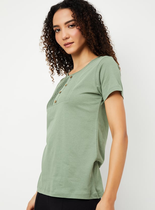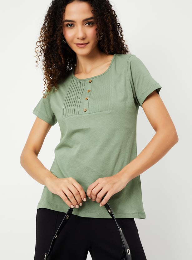 Spruce up your wardrobe with this stylish solid-toned top! Featuring a round neck, half sleeves, and a pintuck yoke with buttons, it’s the perfect blend of chic and comfy, adding a touch of flair to any outfit.