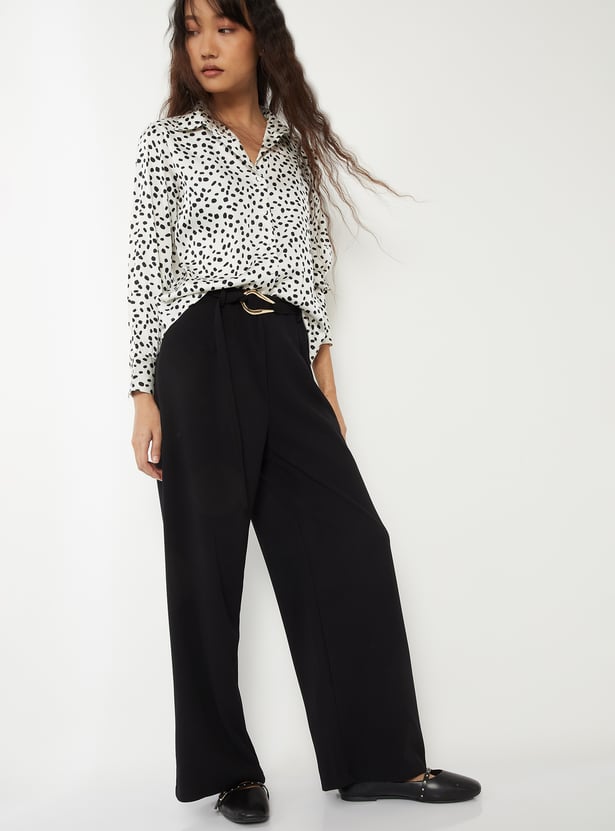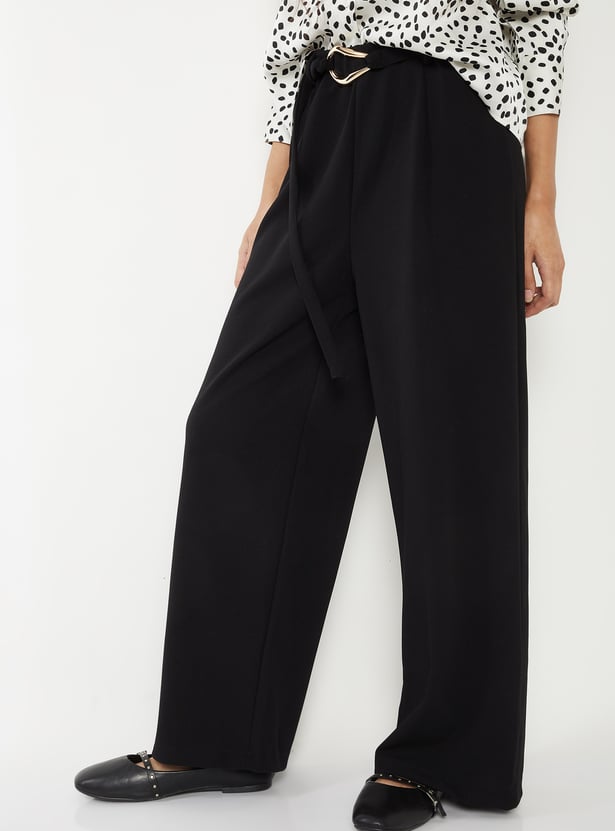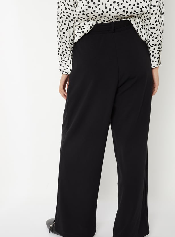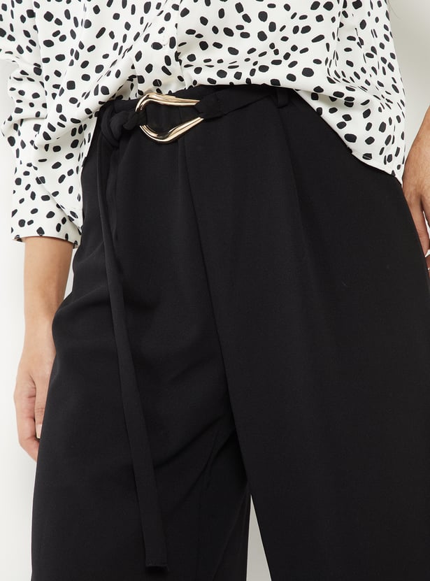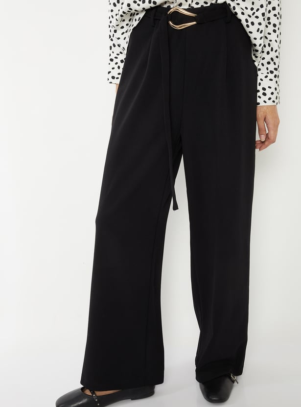 Polished and contemporary, these pleated wide-leg trousers are designed with a button closure, belt loops, and a belted waist for a structured yet stylish fit. The pleats add sophistication to the flowing silhouette, making them a versatile choice for both workwear and casual outings.